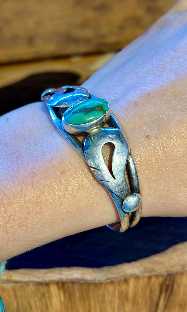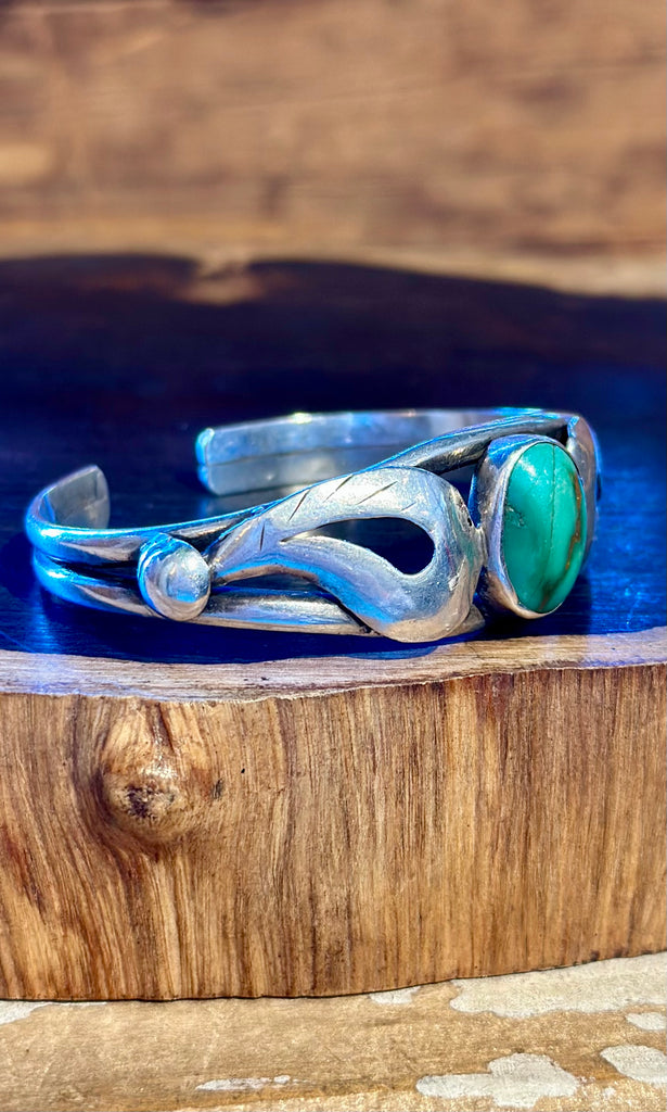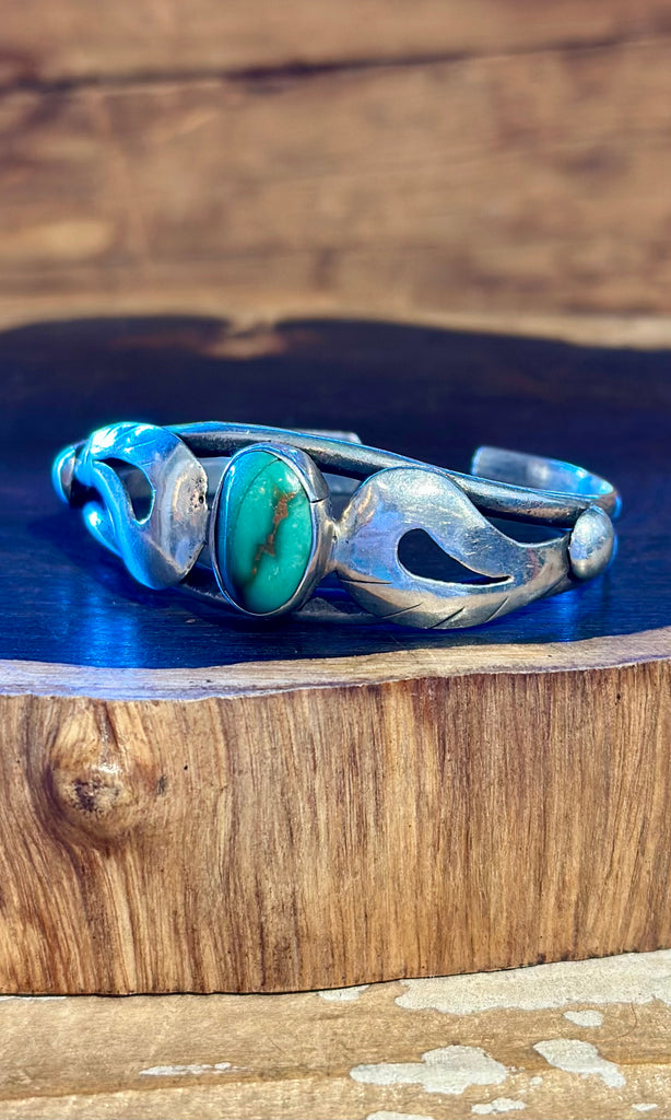 A sweet small wristed cuff. This piece features an oval shaped, green turquoise stone set in a simple bezel. Wonderful silver applique along the frame of the open cuff. Most likely Navajo made.
