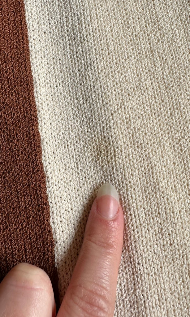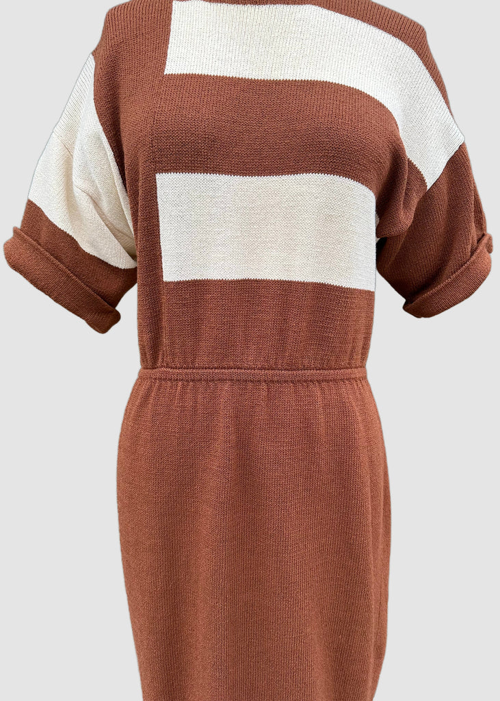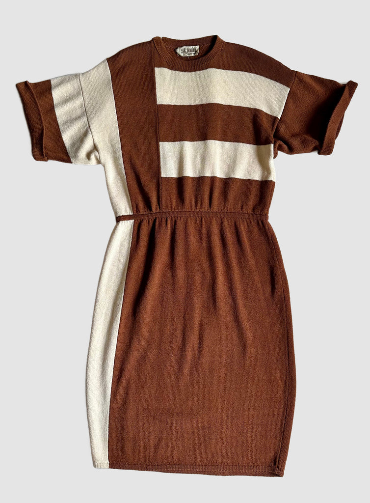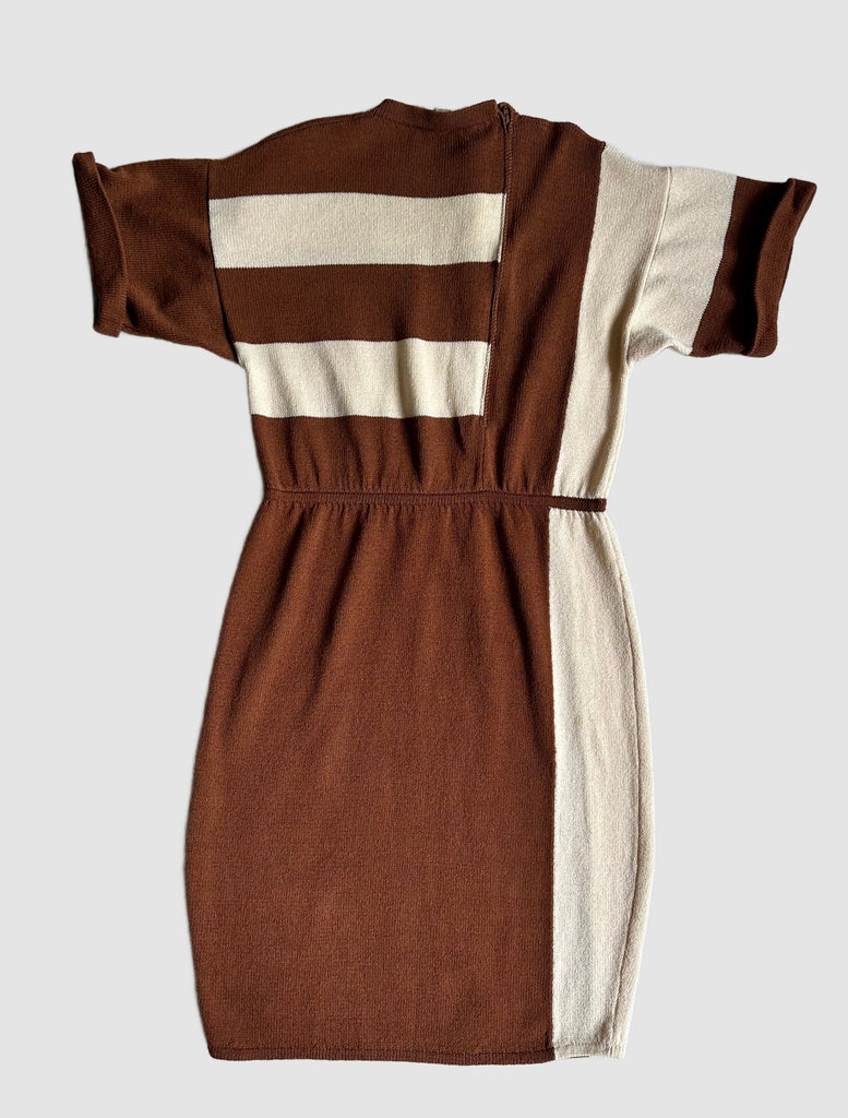 Super cool late 70s, early 80's St. John ribbed knit dress. Features a two tone brown and cream color contrasting at the top half of the dress, plain brown from the waist down. Cute oversized short sleeves that roll up. Half back zip closure that runs diagonally. Lots of stretch and room for different sizing options. This whole dress screams asymmetry madness! Such a unique ribbed knit piece.