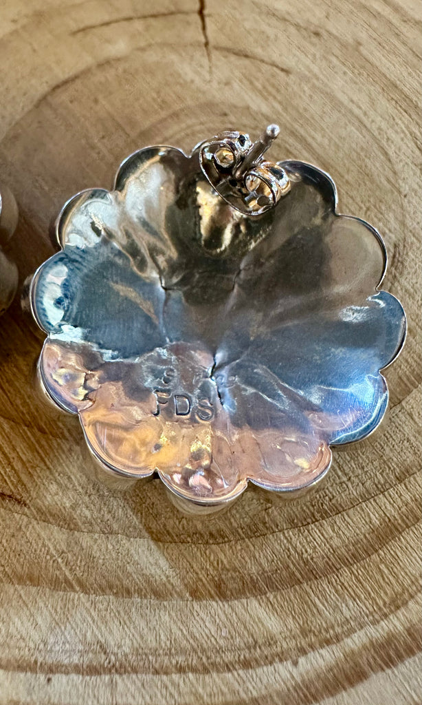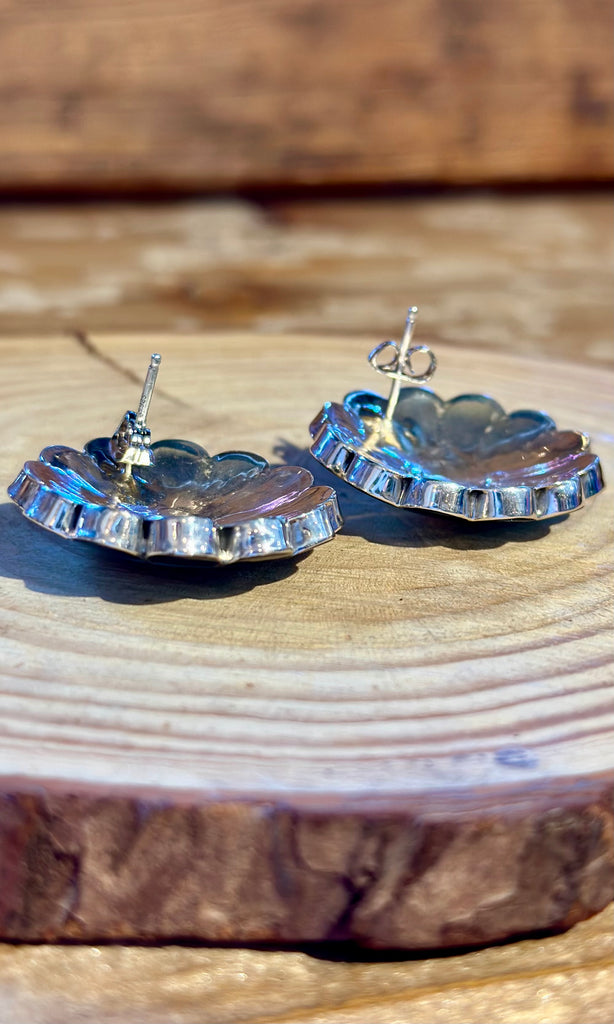 Absolutely gorgeous Zuni sun face stud earrings. This pair features an inlay design of bright blue turquoise petals, jet, coral and mother of pearl. Made by Zuni artisans, Frederick and Denise Suitza, with a hallmark of FDS stamped on the back. Truly stunning pair!