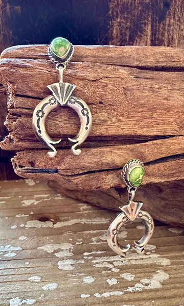 Gorgeous pair of Naja sterling silver earrings handmade by the Navajo artist Adrienne Gordan. Feature beautiful green turquoise stones at the top set in a plain bezels. Navajo stamping around the silver horseshoe shape. Stunning matte polish to really make this pair pop. Sterling silver stud closures.
