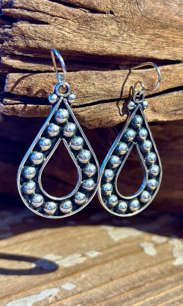 Beautiful handcrafted sterling silver earrings with decorated silver beads that look like floating bubbles floating along a teardrop shape. Wonderful patina background color to make the silver pop. Sterling silver hooks.