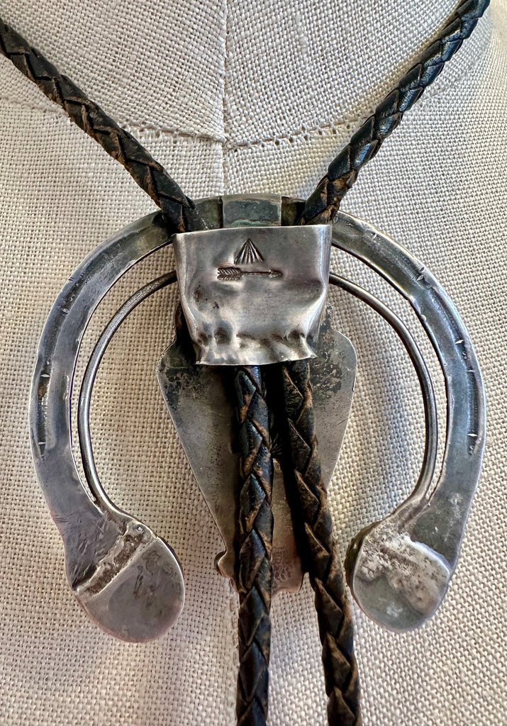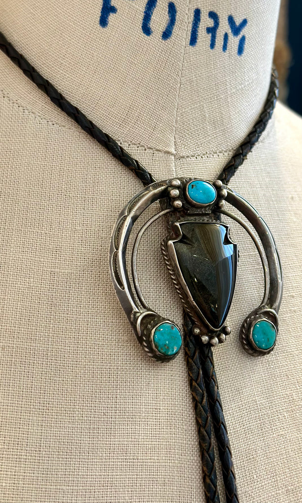 Aged to perfection, this wonderful vintage bolo was made by Navajo artist, Art Lewis. It is from the Choctaw Nation with a Naja crescent symbol and arrowhead onyx stone, as well as three kingman turquoise stones, all set in simple bezels and twisted silver wire frames. There are silver beads and arched stamp details along the crescent shape. Black leather cord, silver tips and a silver backing that you can easily slide the cord to adjust it's length.