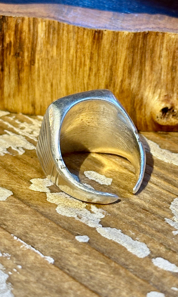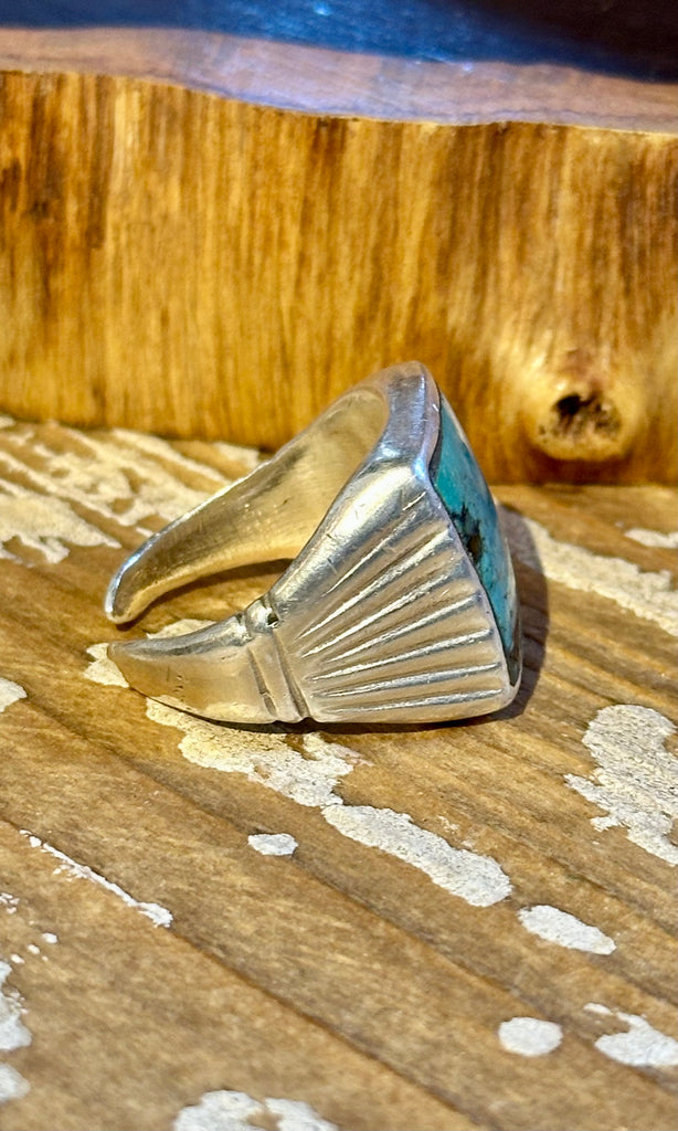 Large statement sterling silver and square turquoise Men's ring. This vintage piece features a tucked-in cabochon with black matrixing and set into a simple bezel that looks like a picture frame. Thick silver band with feathered carvings on the side. Tapers towards the back to an open band. Nice vintage appeal to the ring.