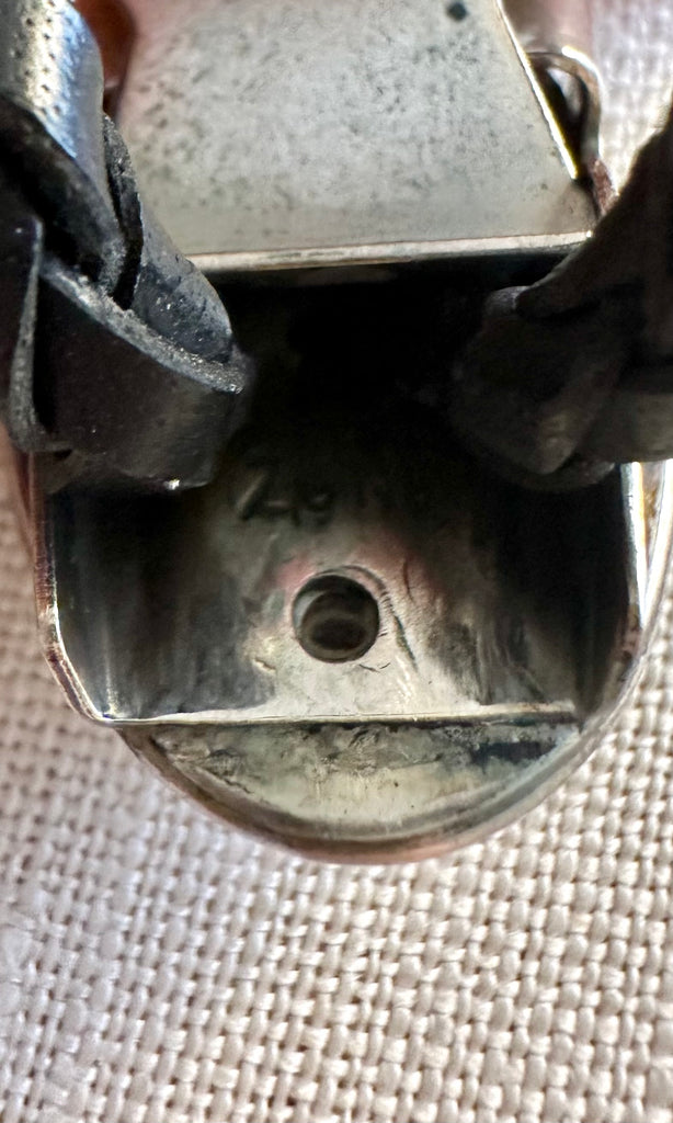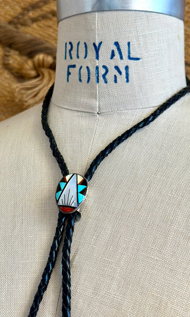 Vintage Zuni bolo made by artisan, John Q. Bowannie. This piece features a rather small but mighty multi stone inlay design of mother of pearl, coral, turquoise and jet. Secured with a braided leather cord with silver tips and an easily adjustable clip back. Signed Zuni, very hard to photograph hallmark but it is signed on the back.
