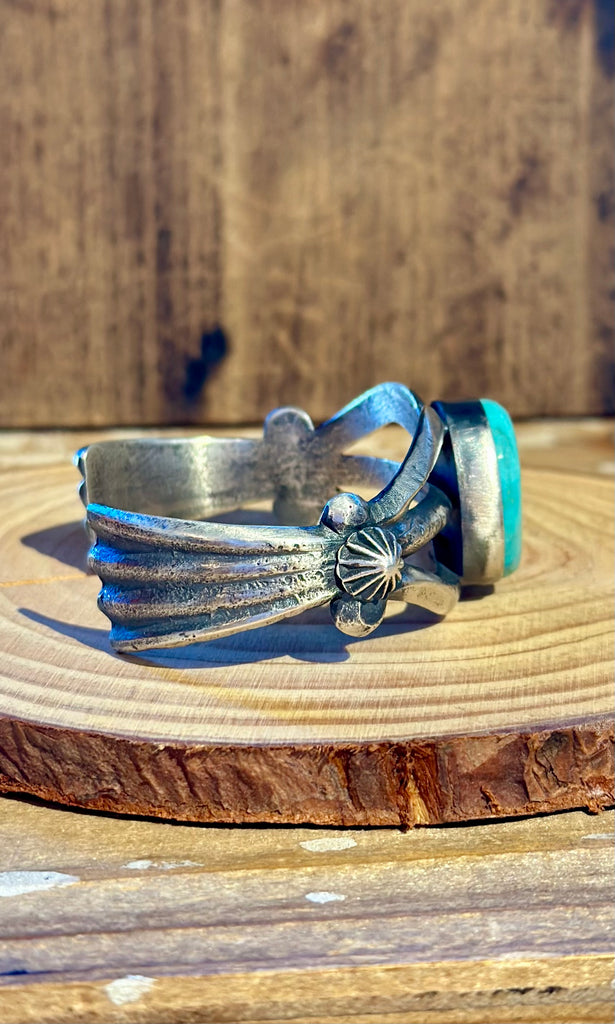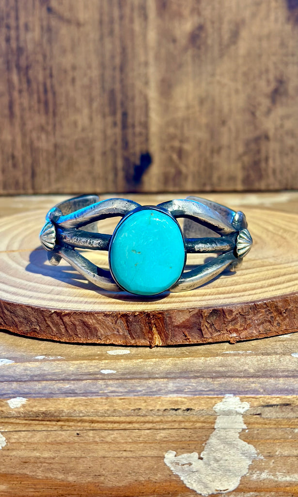Brilliantly handcrafted silver sandcast cuff made by Navajo artist Chimney Butte. The bracelet features a bright blue turquoise stone set in a basic bezel with a lovely patina to the sandcast band that has 2 concho buttons on the sides. The shape of this cuff is truly stunning. Perfect for a smaller wrist.
