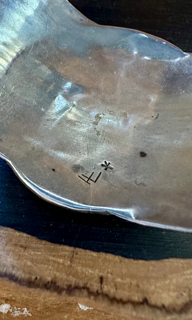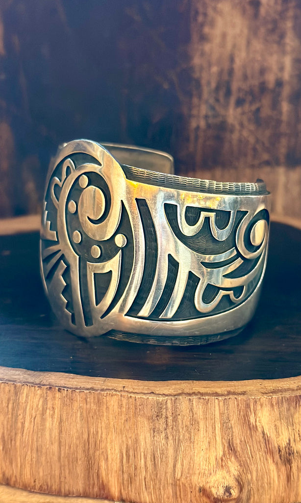 Wonderful Hopi cuff with detailed overlay design. The overlay has a unique Hopi design all along the wide band. There is also an extended piece of silver along the top and bottom with hammer marks all along it. Hopi made with the artisans hallmark of HL. Nice and thick silver band. Such a detailed work of art!