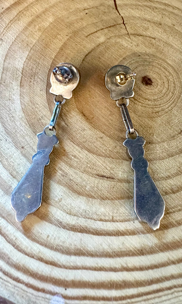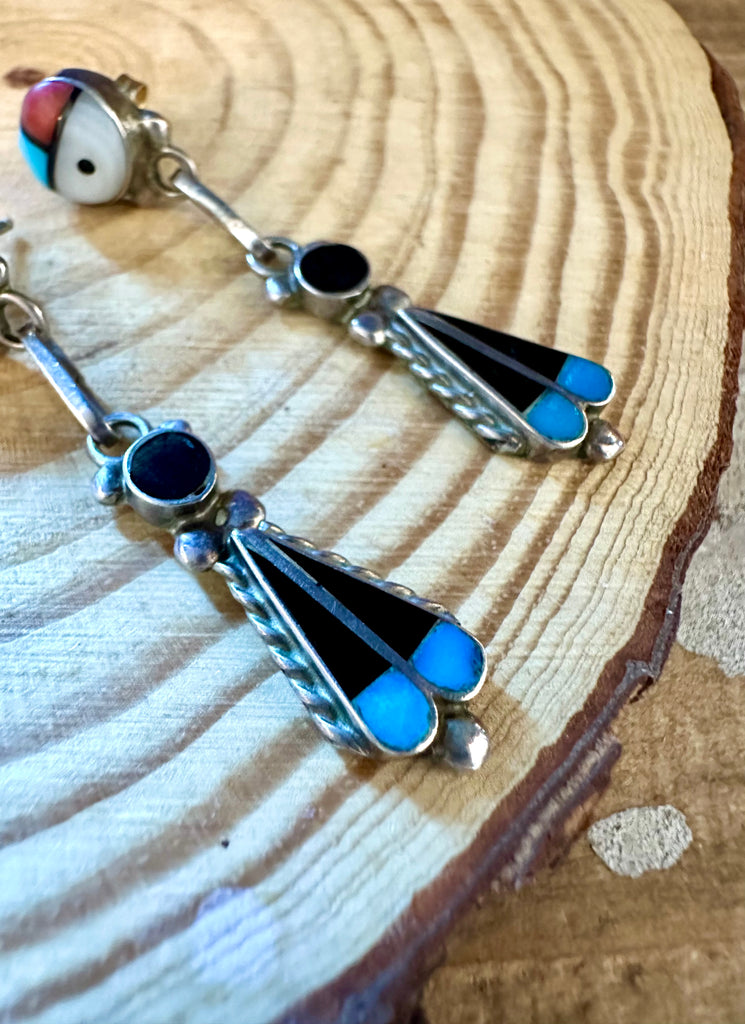 Beautiful vintage Zuni stud dangle earrings. Features mother of pearl, jet, turquoise and coral inlay all set in simple bezels. The top sun face connects to jump rings to the bottom inlay pieces that are framed in twisted silver wire. Silver stud backings. No hallmark, however may have rubbed off from age.