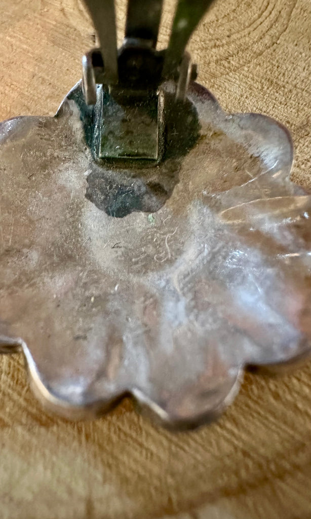 Beautiful vintage clip-on earrings of a Zuni sun face and what looks like a flower. Mother of Pearl make up the petals, and an inlay of turquoise, coral and jet make up the sun face in the middle. All set in simple bezels with silver clip on backings. It looks like most of the artists name has rubbed off from age. Such a cute pair of Zuni earrings.