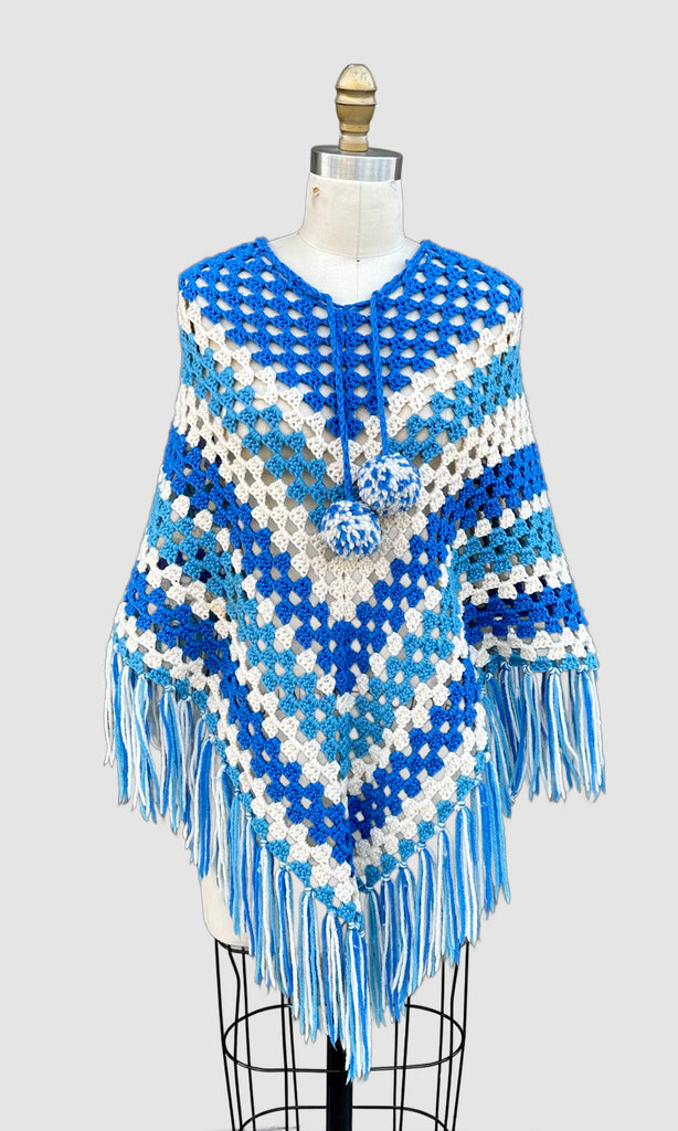 Fun 1970s hand knit poncho sweater. This crochet piece features cool artic blue and white colors that run in a chevron pattern down the front and back of the poncho. Fringed tassels at the bottom and a tie at the top to close the neck up for warmth. Two pom poms dangle at the end of the yarn closure. No lining. Such a fun knit poncho!
