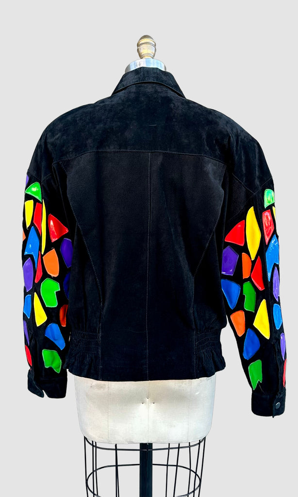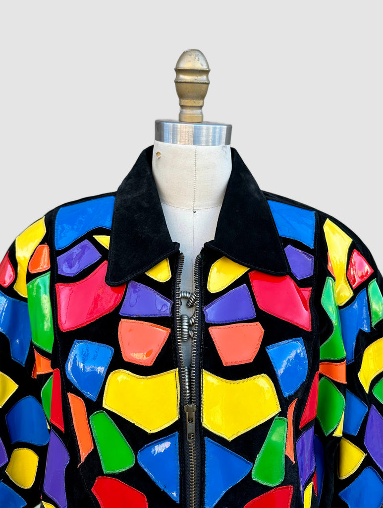 Amazing mosaic patchwork leather jacket from roughly late 80's, early 90's by the brand, Cedars. The rainbow leather pieces all have a shiny finish and pieced together like a piece of stain glass or mosaic painting. Features a front zipper closure, shoulder pads and black satin lining. Such a fun jacket!