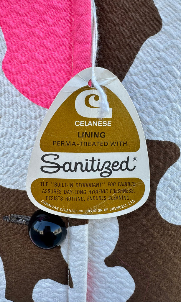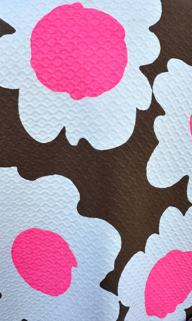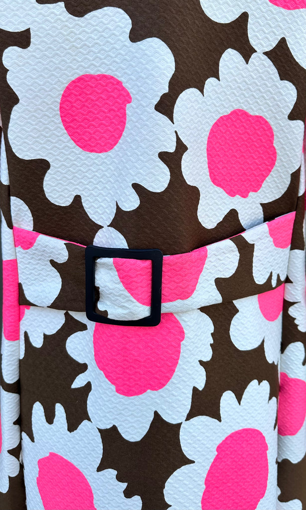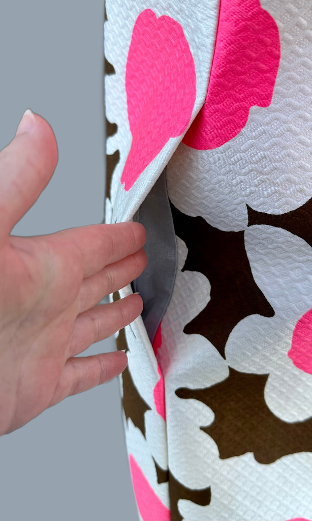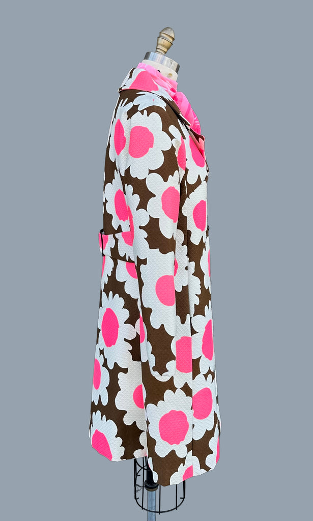 Striking deadstock coat from the 1960s featuring an oversized floral print in warm brown, pink, and white tones. This piece captures a true mod, Mad Men-era aesthetic with a bold yet wearable statement.