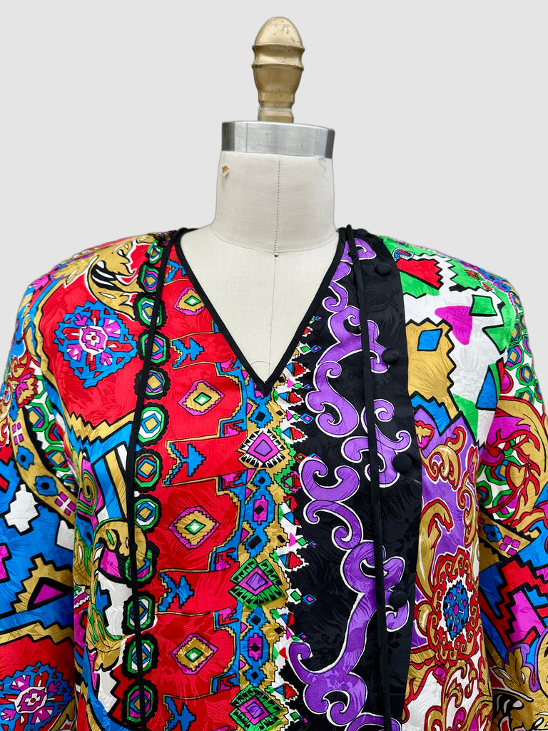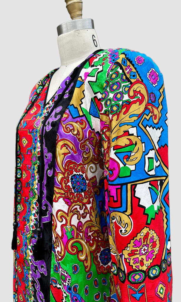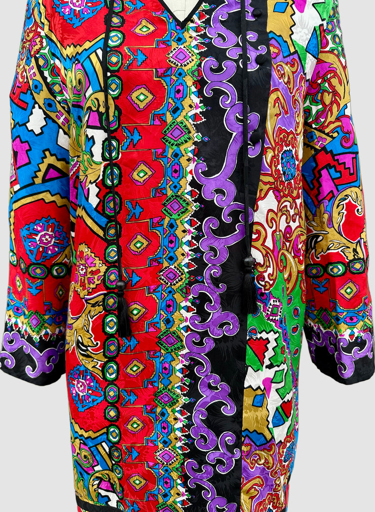 Gorgeous 100% silk Diane Fries dress. This piece features loud abstract prints, 2 tassels that run down from the shoulders to the waist and 5 covered buttons that run down the left side of the chest diagonally for closure. The buttons give it a modern kimono feel with the Asian influenced prints as well. Very free flowing, 2 shoulder pads (can be removed). Such a fun dress!