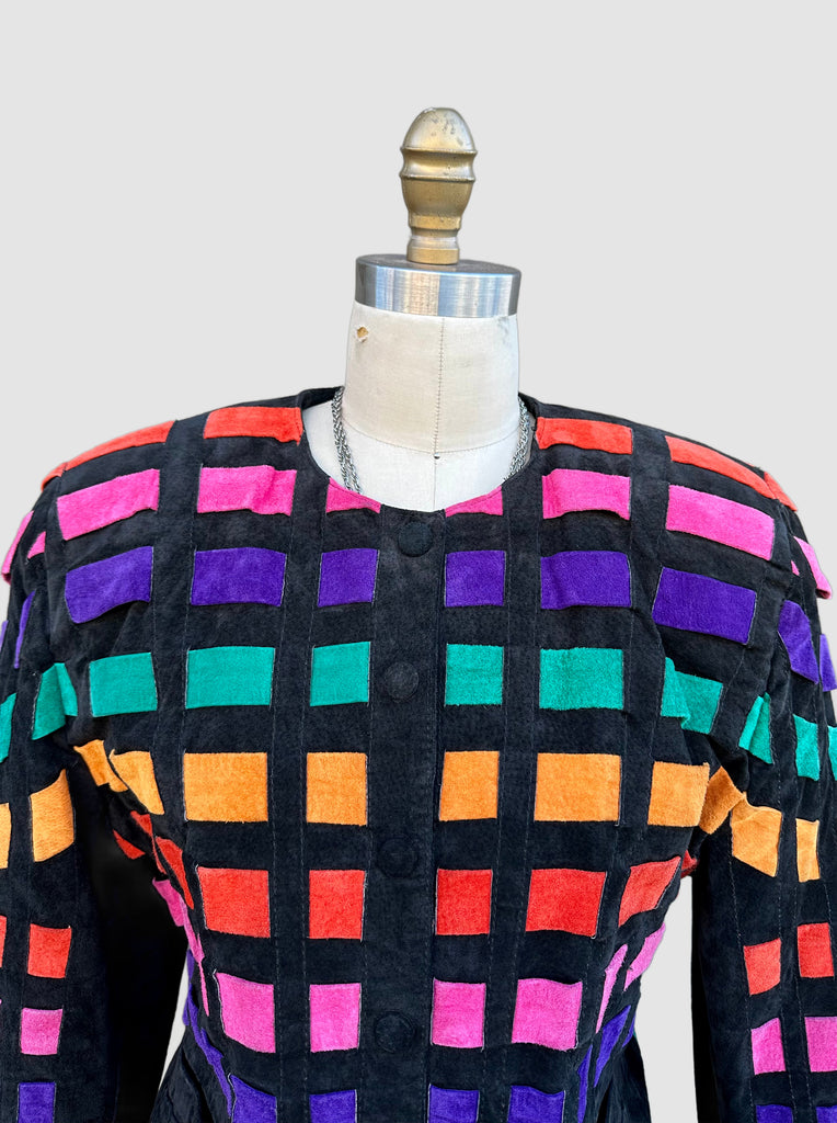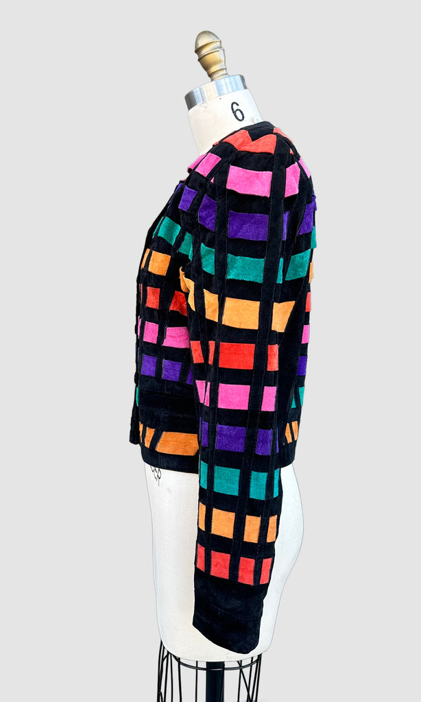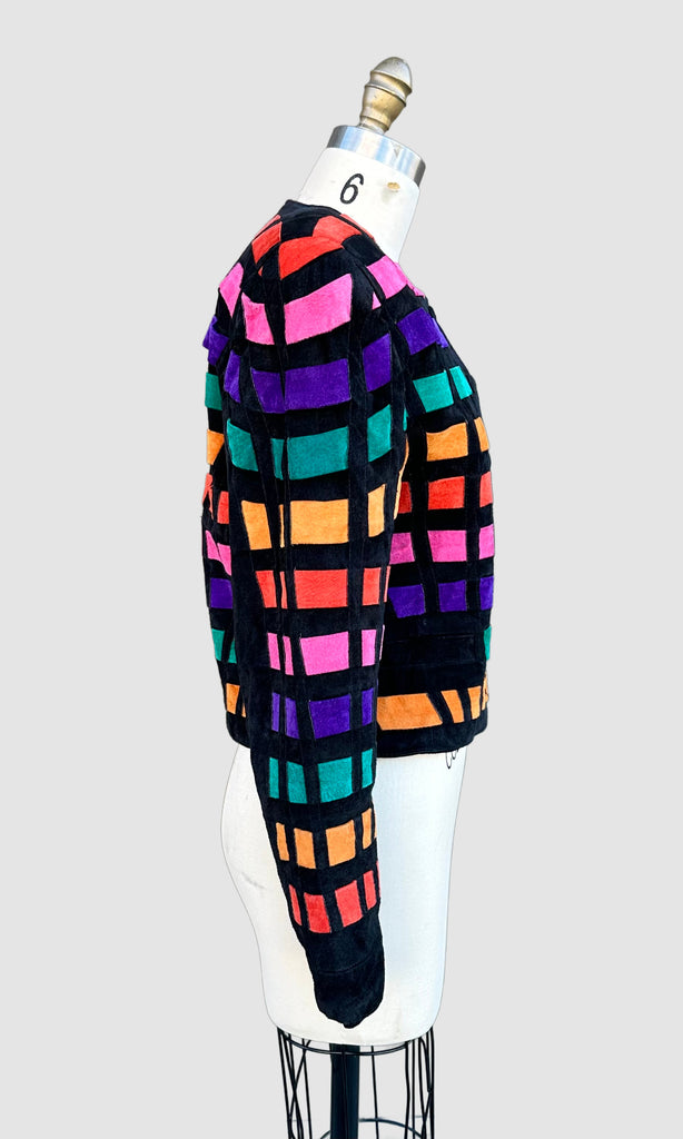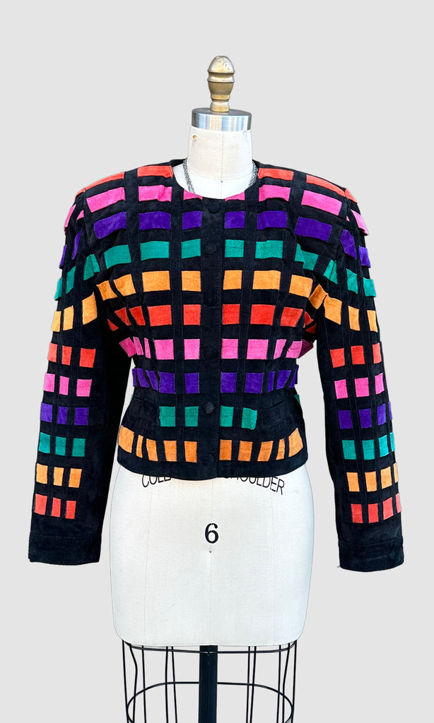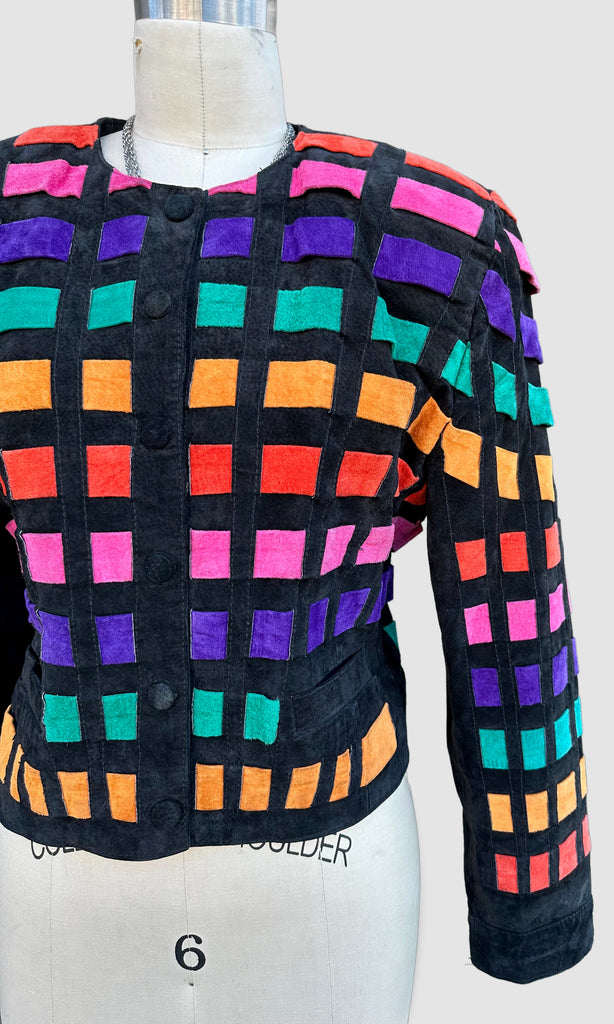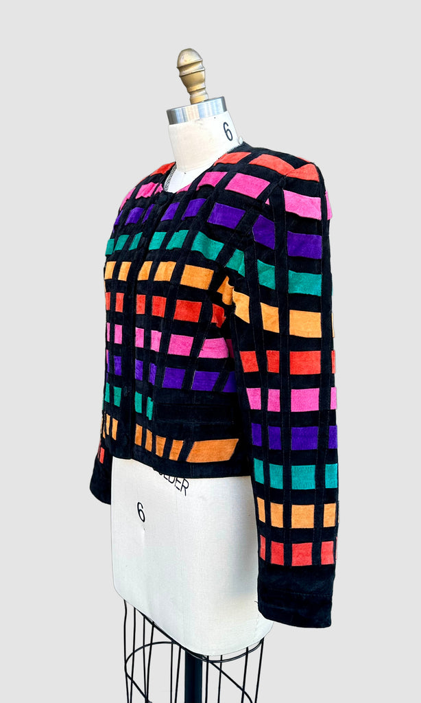 Show stopper disco patchwork leather jacket from roughly late 80's, early 90's by the brand, Dino'z. The patchwork leather pieces are all interlaced in a horizontal pattern that looks kinda like a disco floor! Features 6 button snap closures with covered black suede buttons, shoulder pads and a fun printed satin lining.