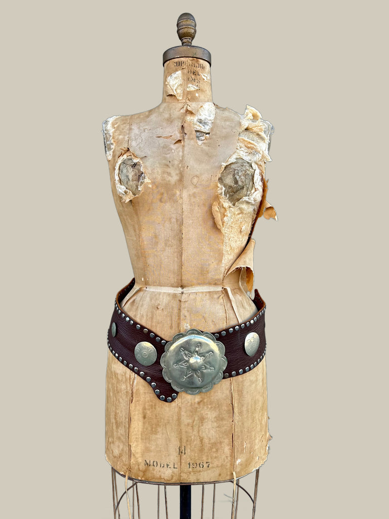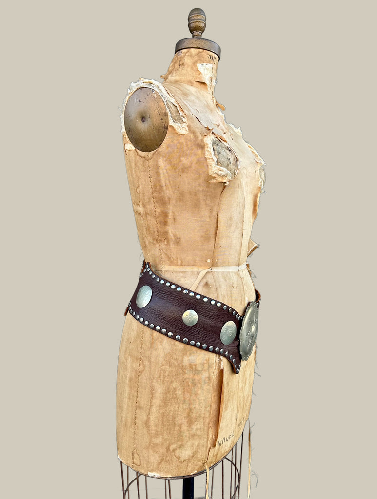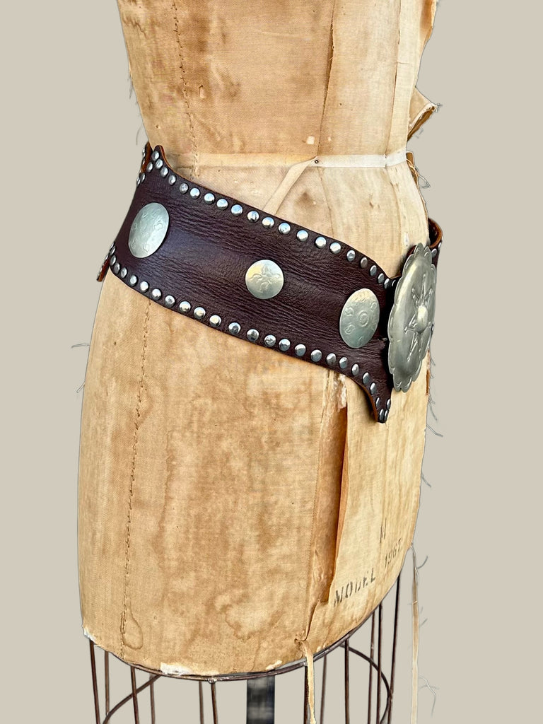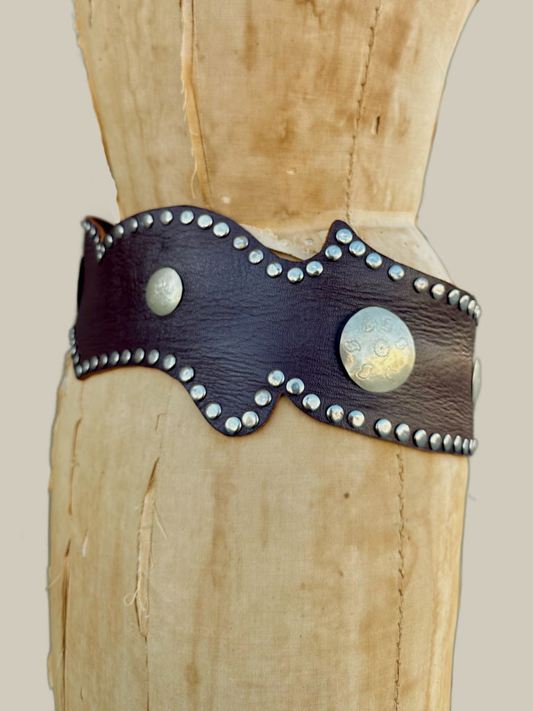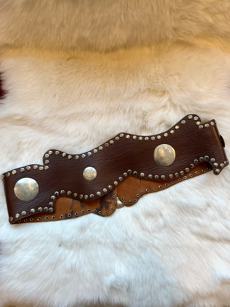 MOROCCAN BELT Scalloped Thick Brown Leather Belt, Silver-Toned Metal Hammered Disks