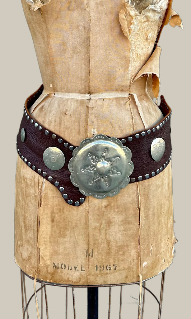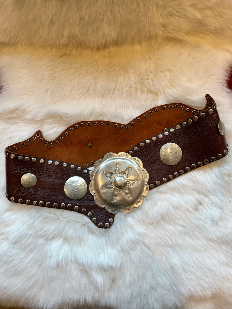 Amazing brown leather scalloped belt handmade from Morocco. This statement belt features seven stamped silver- toned metal disks and one big scalloped edged hammered silver metal disk in the middle. These silver pendants showcase sun or flower patterns with varying size. On the edge of the leather belt are silver toned studs. Secured with a hook, this belt can be worn on the waist or hip.
