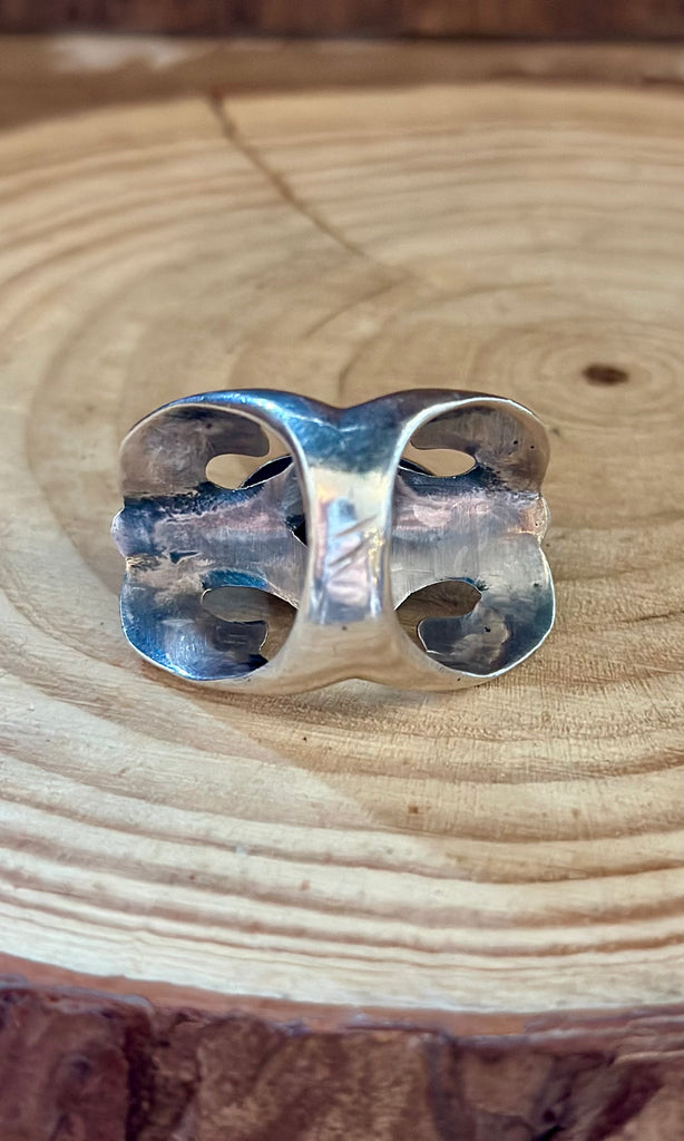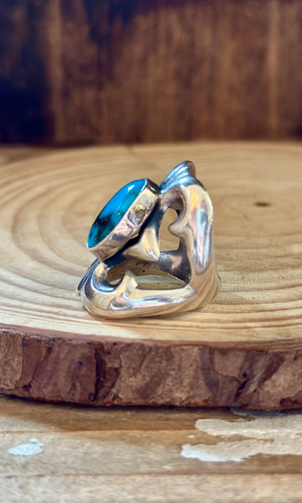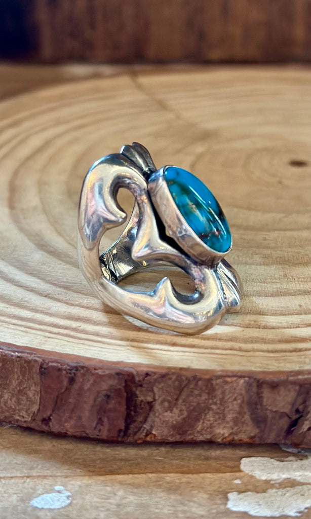 Gorgeous sandcast silver and turquoise vintage ring. This piece features a beautiful sandcast design that frames the turquoise stone in such an elegant way. Stone is set in a simple bezel. This ring Navajo made but due to age the hallmark may have rubbed off. Split single band.