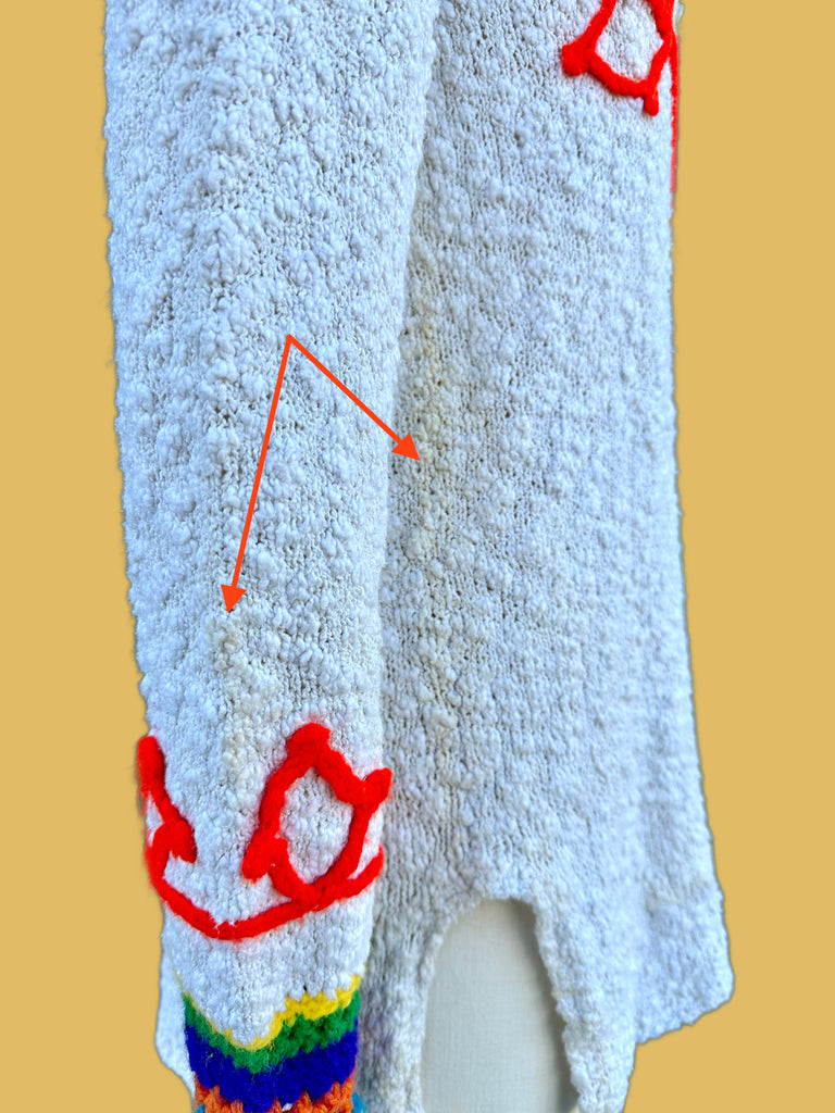 Super fun 1970s hand knit long sleeve top. This piece features bright neon crochet accents along the collar and sleeves with a cream color base in a very cozy knit material. There are 7 round clear buttons at the top collar for closure. Nice stretch to the material as well, the bottom cuff of the sleeves are a bit tighter but once worn will probably stretch out. There are areas of yellow discoloring but honestly hard to tell because of the cream base color. Such a fun bright sweater!