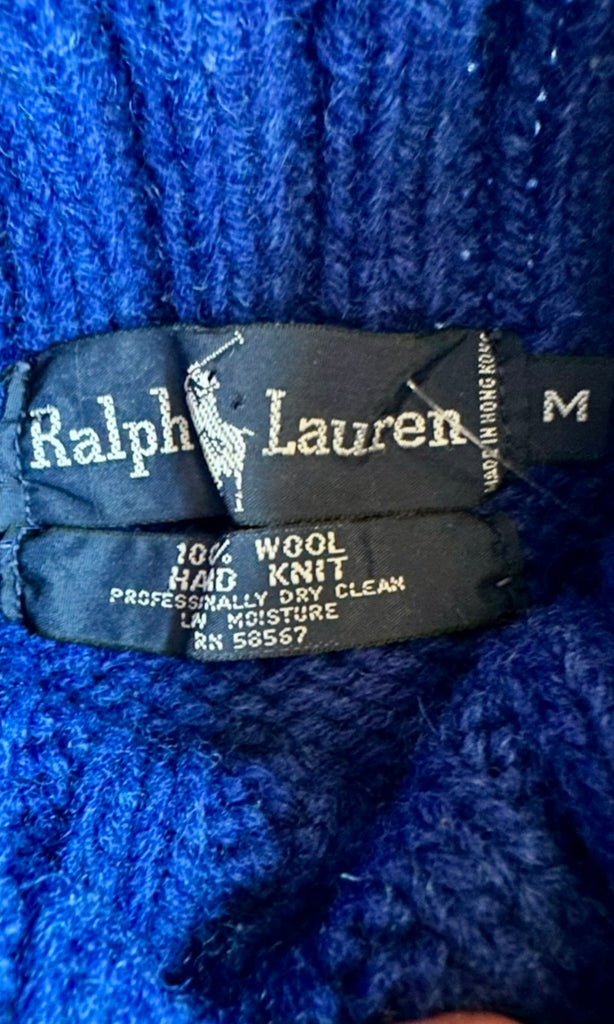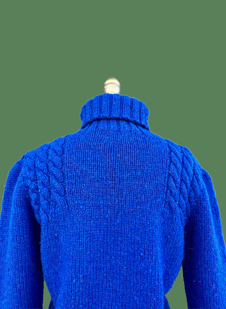 The coziest Ralph Lauren chunky cable knit sweater. Roughly from the late 80s early 90s from the Ralph Lauren polo collection. Made of 100% wool, in a gorgeous bright blue color. There is a thick raised turtleneck that rolls down for style or up for warmth. Material has a nice amount of stretch. There are three braided cable knit patterns on the chest that follows back towards the shoulders.