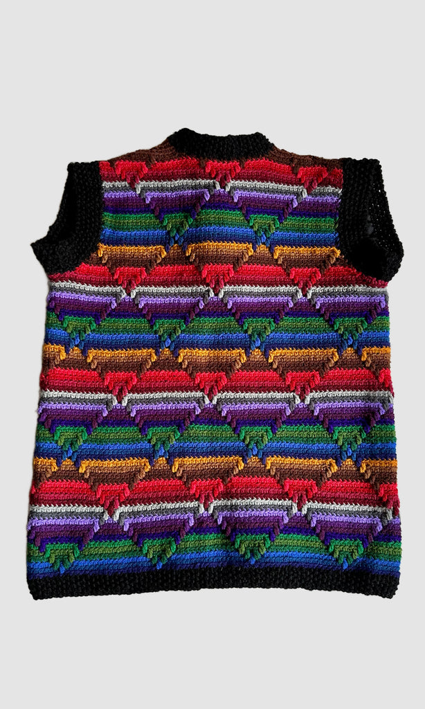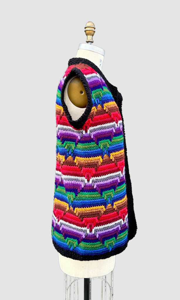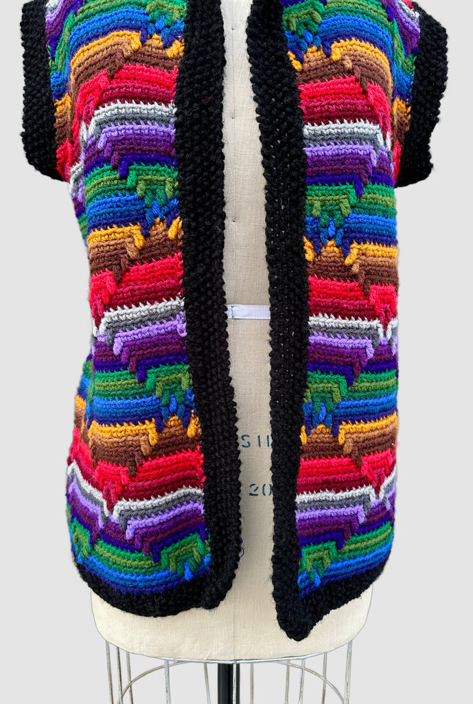 Fun 1970s hand knit sweater vest. This crochet piece features an array of muted rainbow colors with a black knitted border. The intricate knit design is made up of irregular stripes in a horizontal pattern. Worn open with no closure, facing where the black knit border is, please see photo. Can be worn oversized.