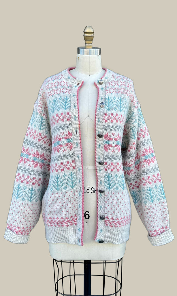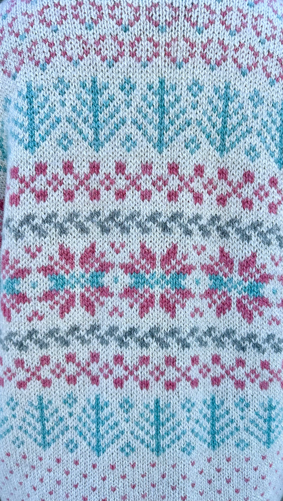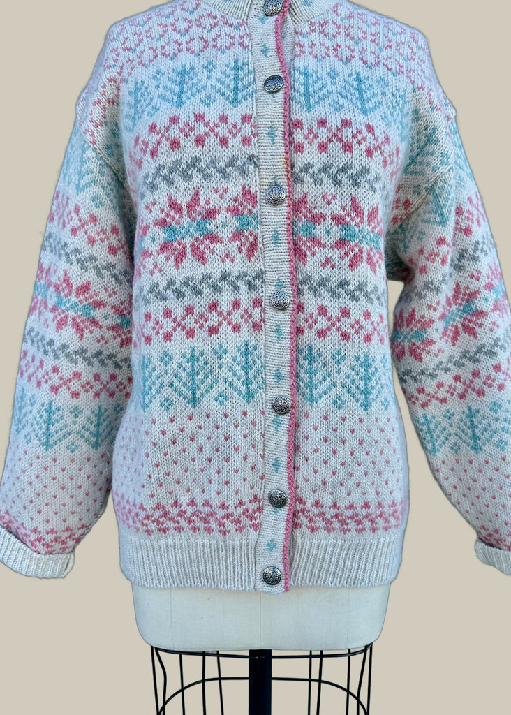 Cozy pastel snowflake sweater, roughly from the late 80s, early 90s. This piece is made in Freeport Maine by the brand L.L. Bean. Features a geometric winter pattern of snowflakes and hearts all throughout the sweater in pastel pink and blue colors, with a cream base. There are 7 silver metal buttons that run down the middle for closure. Some stretch to the material. A perfect winter staple sweater.