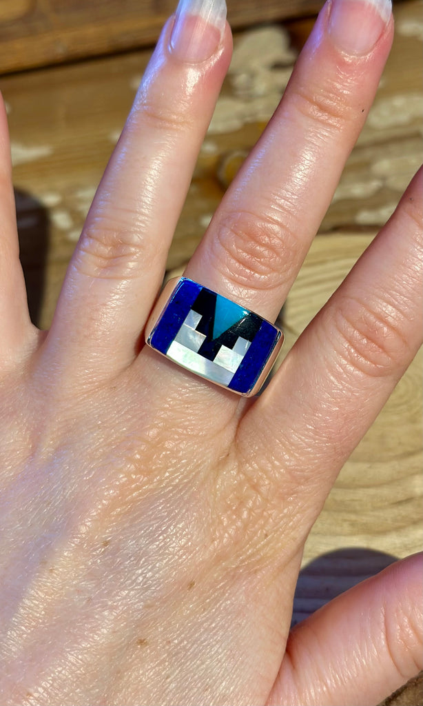Stunning vintage square inlay ring that features a geometric design of jet, mother of pearl, turquoise and lapis. Nice thick sterling silver single band. Navajo made with the stamp "HOZHO" which has several meanings, balance, harmony, beauty, peace, health and wellness. It is both a spiritual philosophy and a daily practice in Diné culture — how you walk through life, make things, and treat others. Such a special piece!