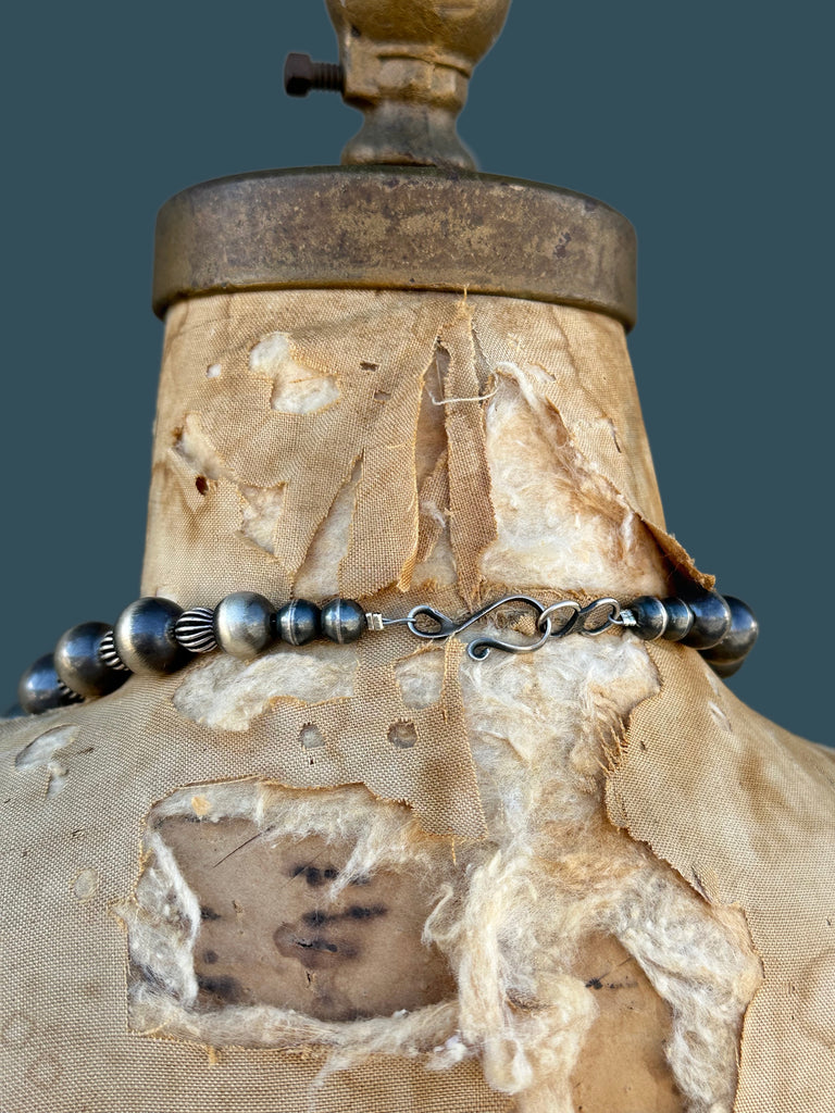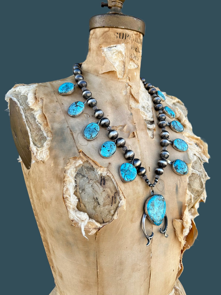 This Squash Blossom is designed with 10 brilliant free form turquoise stones and one large center Naja pendant. The chain is made up of sterling Navajo beads, melon beads, and hook and eye closure.