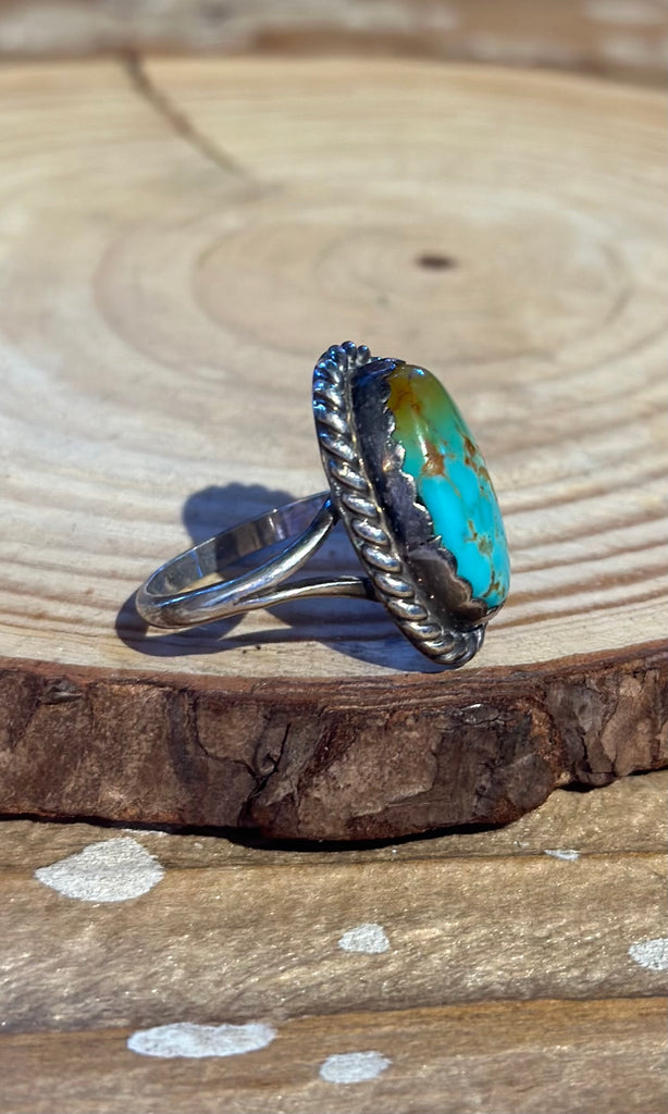 Beautiful vintage turquoise and sterling silver ring. This piece features a gorgeous turquoise stone with light touches of brown matrixing set in a scalloped bezel and twisted silver rope that frames the piece. Double split single silver band. Nice vintage patina to the silver as well. Hallmarked by Navajo artisan.