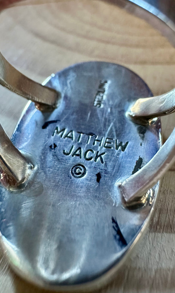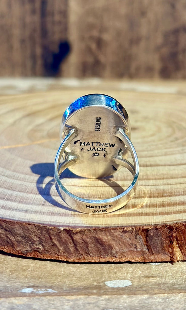 Handcrafted ring features multi-stone inlay design of a pueblo night sky. Matthew Jack is a noted Navajo artist known for creating intricate, high-quality Native American inlay jewelry, often in a style that overlaps with traditional Zuni techniques. He is recognized for his "micro inlay" work, featuring precise, multi-stone designs, including "Night Sky" or "Galaxy" themes. Detailed with inlay of opal, coral and jet. Set in a simple bezel and double split silver band. Beautiful statement ring.