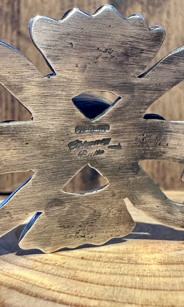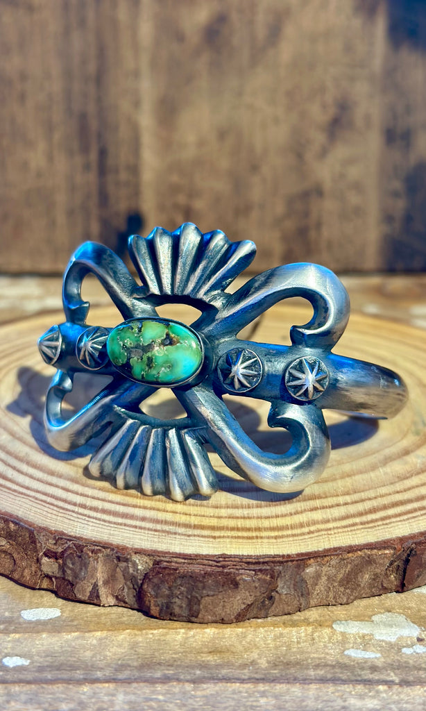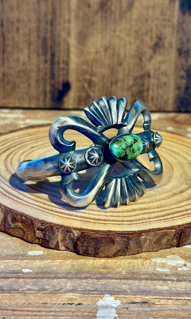 Brilliantly handcrafted silver sandcast cuff made by Navajo artist Chimney Butte. The bracelet features a bright green turquoise stone with a wonderful matrix, set in a basic bezel. There is a lovely patina to the sandcast band with a matte silver patina finish. 4 concho buttons run beside the cabochon. The shape of this cuff on the wrist is truly stunning!