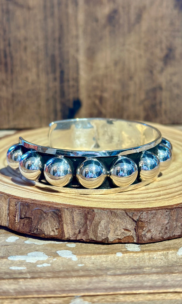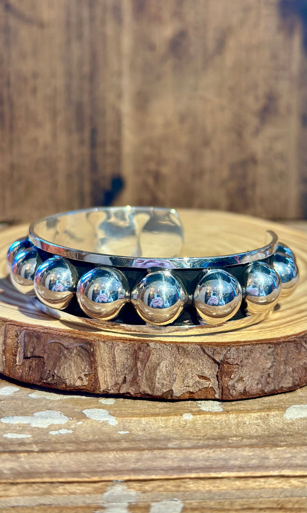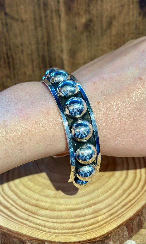 Stunning sterling silver cuff that features large silver beads that look like bubbles all along the band. Made in Mexico. There's a beautiful contrast dark patina within the shadow box detail of the band that make the bubbles pop! Such a unique statement piece.