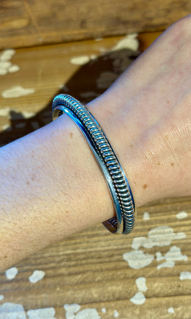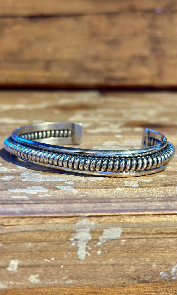 Sterling silver, Navajo coil cuff. This piece features a thick twisted rope detail running through the middle of 2 silver pieces. Carries no stones. Open band. Stamped on one end of the cuff.