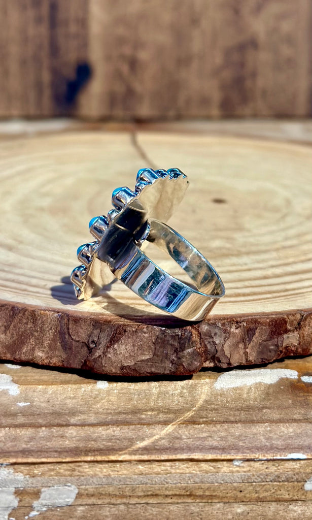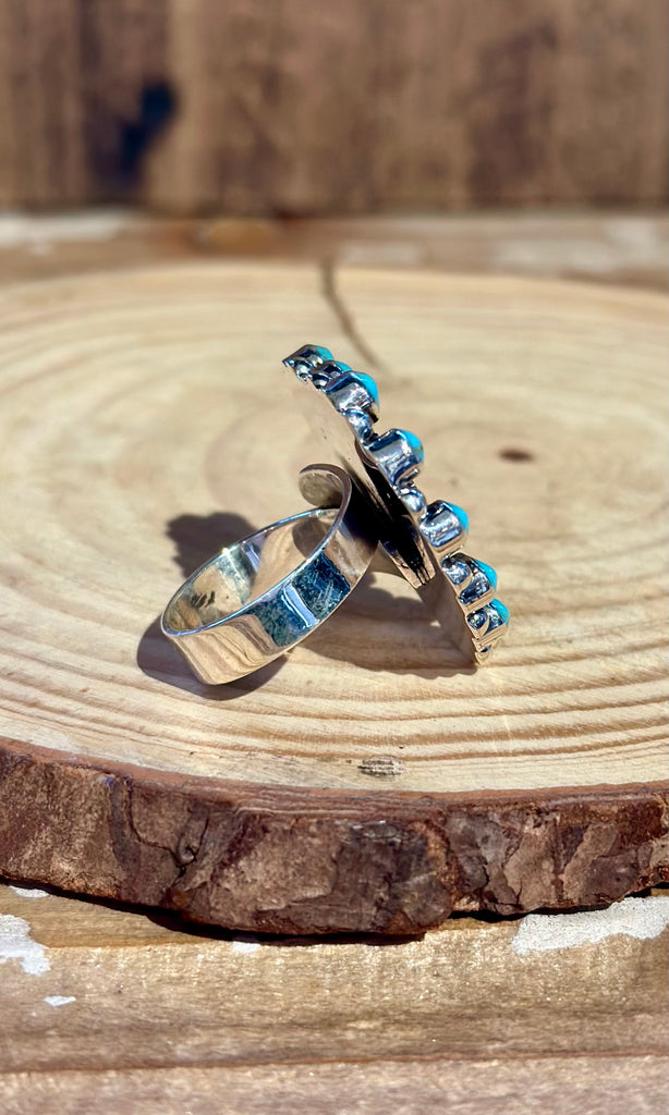 Gorgeous Mexican sacred heart ring. This piece features teardrop shaped turquoise stones set in plain bezels that decorate the frame with silver beads placed in between the stones. The silver sacred heart is placed in the center shadow box. Shiny silver adjustable band to fit a range of various sizes.
