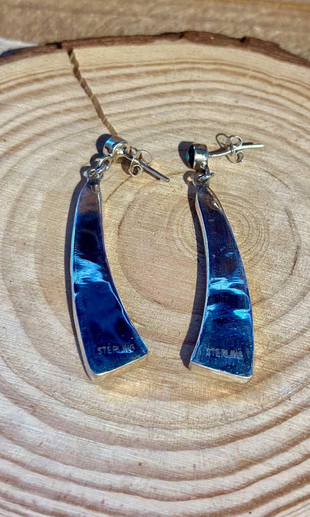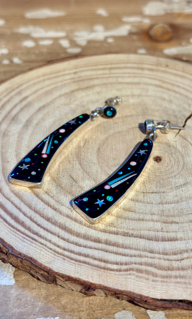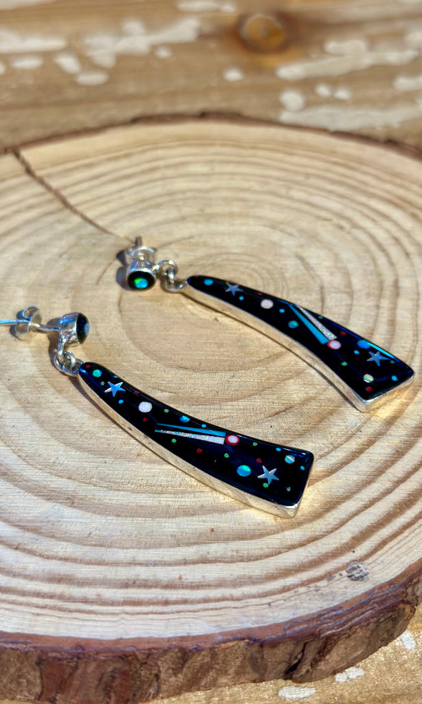 Stunning Zuni night sky stud earrings. This pair features an inlay of jet, opal, turquoise, coral and mother of pearl. This lovely pair has a celestial night sky design with shooting stars. Truly a stunning pair!