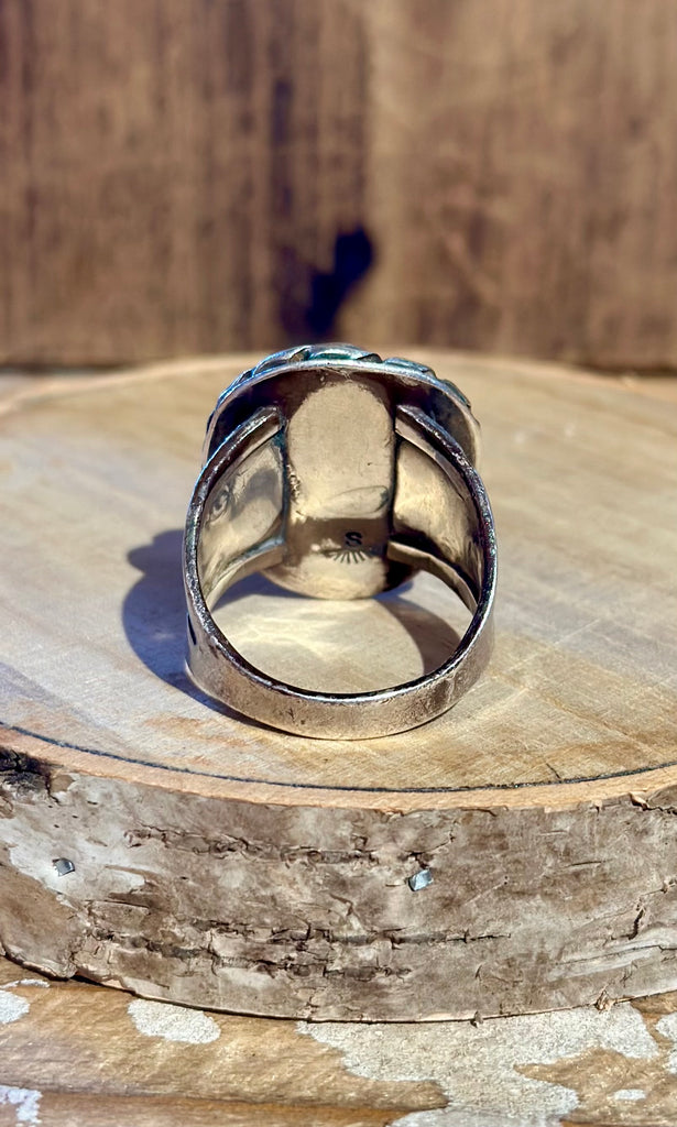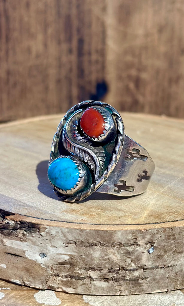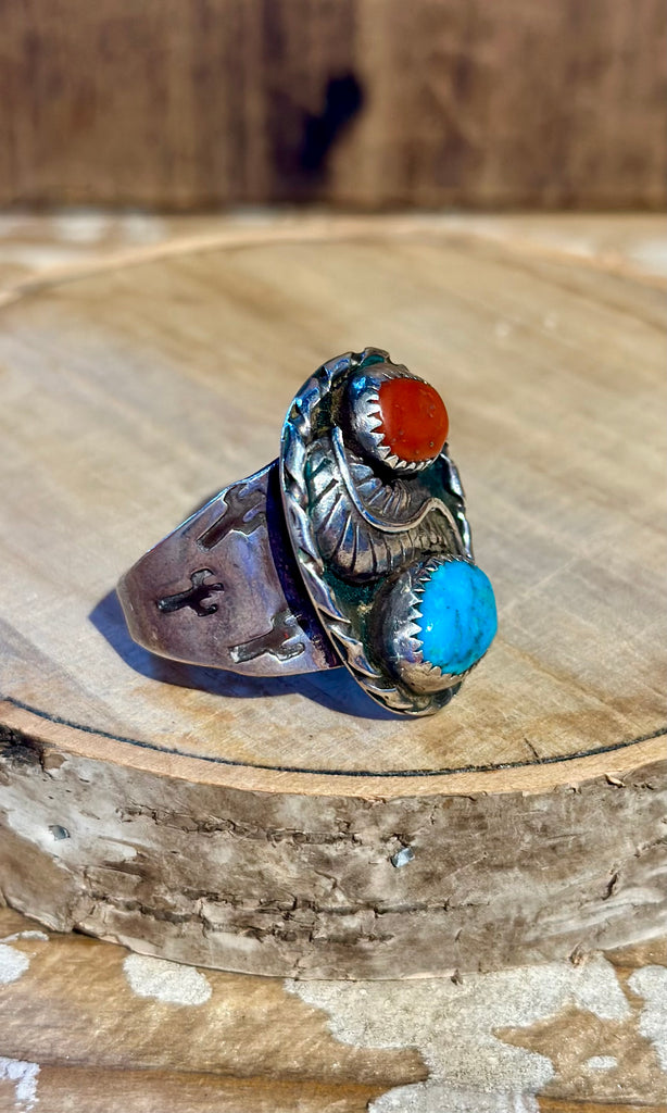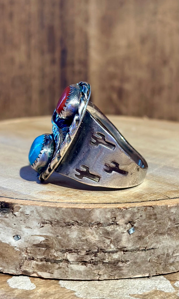 Large turquoise and coral men's sterling silver shadow box ring. Features cabochons set in sawtooth bezels, with a beautiful feather applique set in the center. Twisted silver frame on a thick sterling silver band stamped with cacti details. Large band with well-loved silver. Navajo made with an S hallmark.