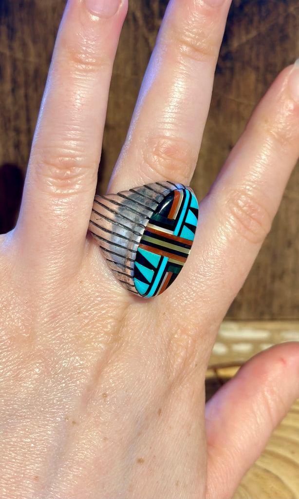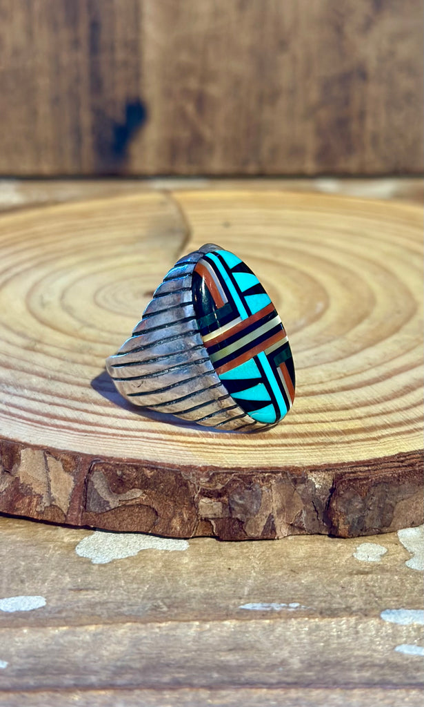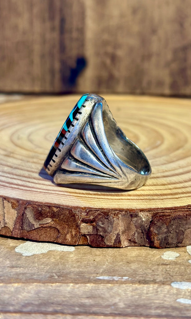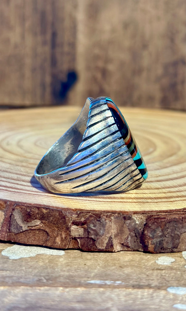 Stunning vintage men's  Zuni statement ring. This piece features a micro-inlay of jet, turquoise, coral and mother of pearl sitting in a notched out silver bezel. Nice thick shank with a different feathered applique band on either side. Very unique band, such a treasure!