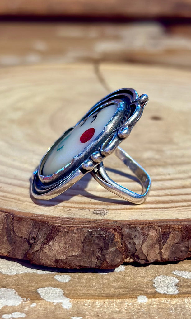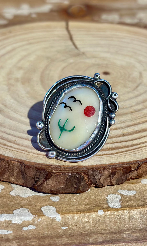 Beautiful vintage Zuni landscape inlay ring. This piece features micro-inlay design of a desert scene with a mother of pearl backdrop, coral sun and green turquoise cactus. The frame itself has silver beads, scrolls and twisted wire to capture the landscape like a painting. Lovely vintage patina. Such an amazing ring!