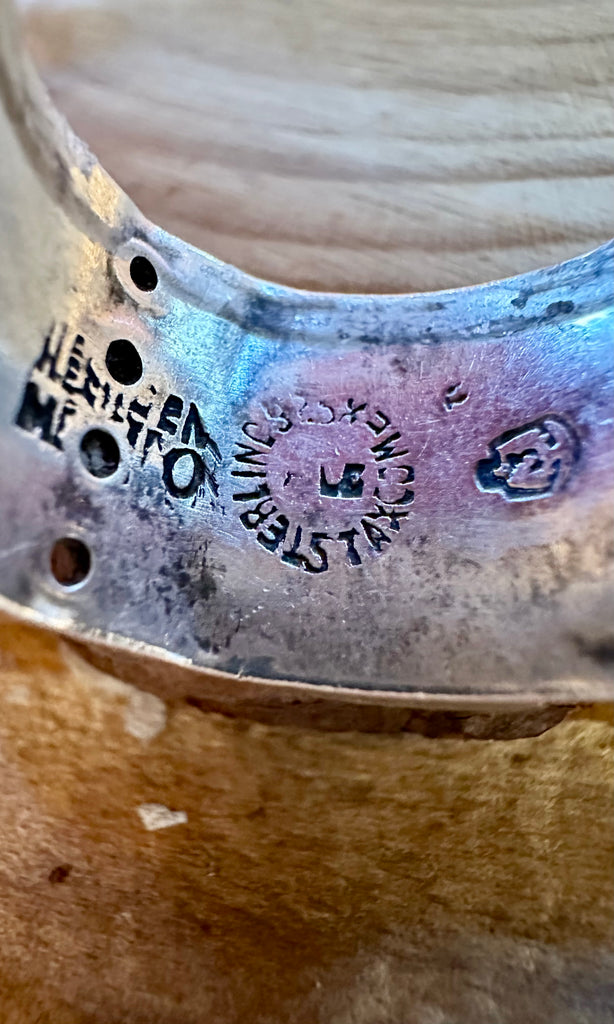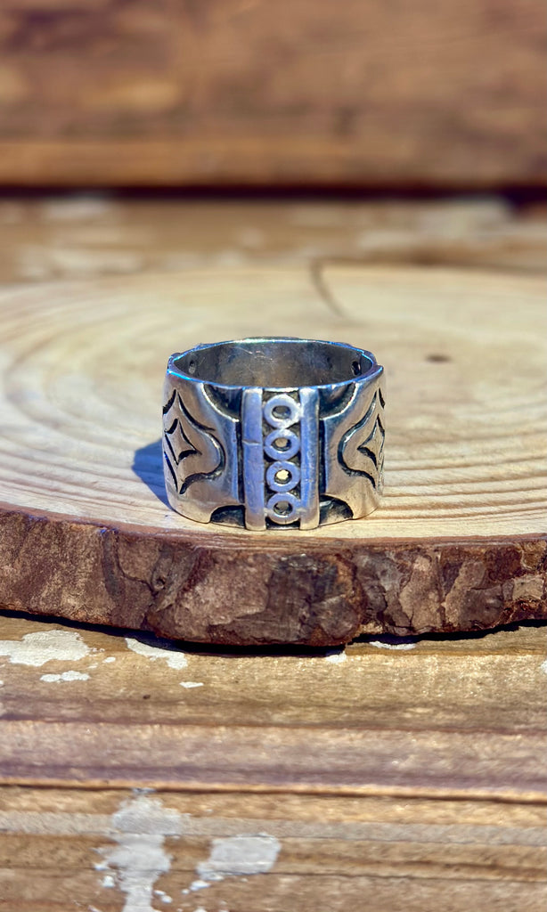 Unique Taxco, Mexico sterling silver cylinder ring. This vintage piece features Mexican geometric carvings and holes that run vertically all along the band. Perfectly round band and signed on the inside.