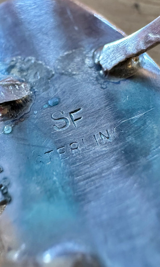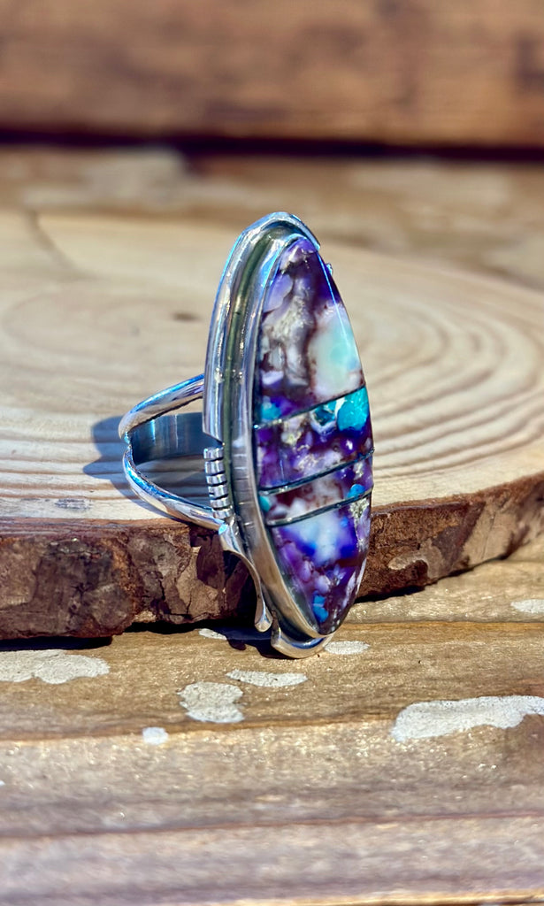 Mystical Mojave turquoise ring, made by Navajo artist, Steve Francisco. This stone is a type of stabilized turquoise, often dyed vibrant colors like the purple you see here, and then mixed with copper and/or bronze metal particles and pressed into bricks to make stunning jewelry. This ring is segmented into 4 parts that have been inlaid in a simple bezel with an asymmetrical notched silver frame. Double split, single band with a a nice shiny polish.