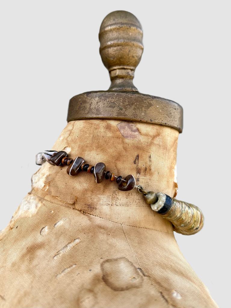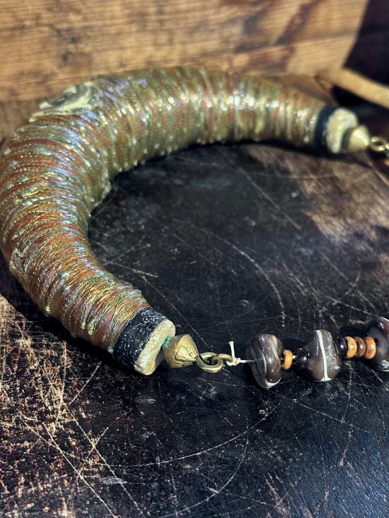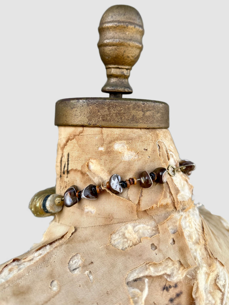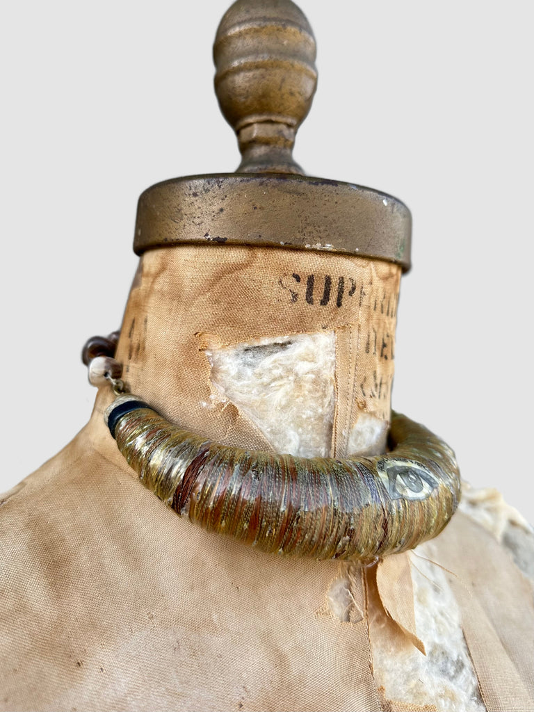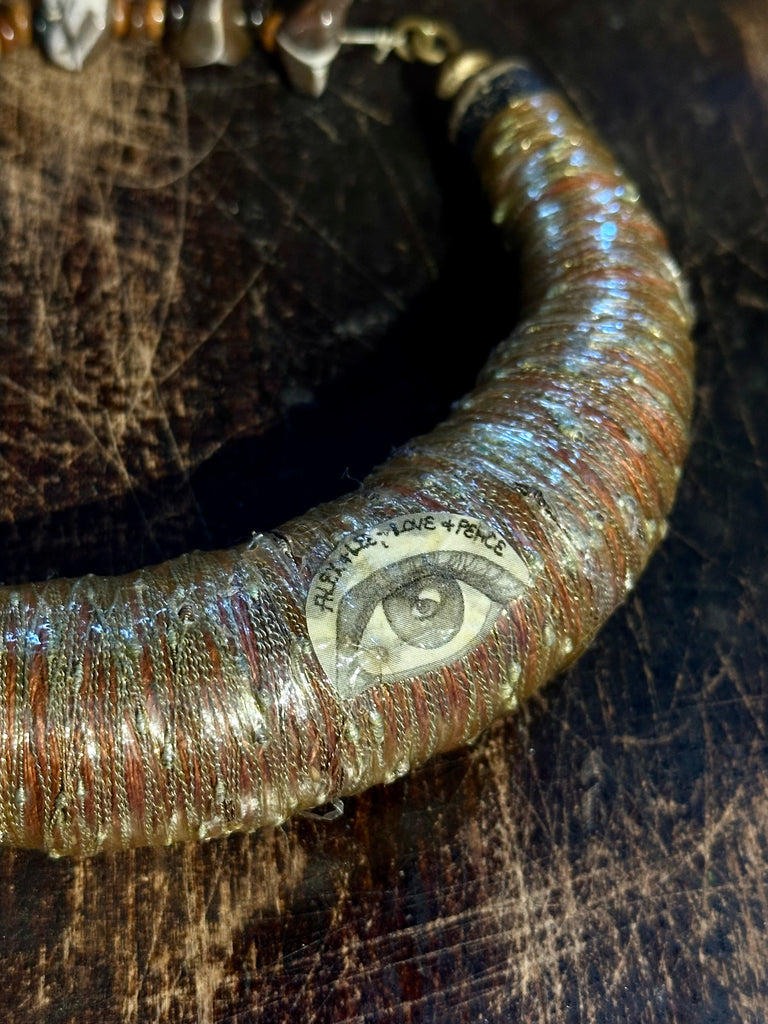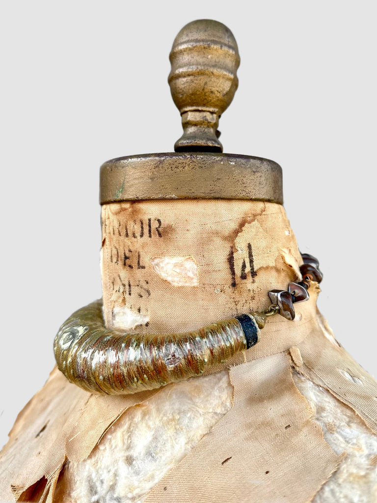 Made by iconic designers, Alex & Lee. Vintage funk era 1970s collector's item and wearable sculpture art jewelry, this choker necklace is a one-of-a-kind piece. This piece features a silk-wrapped front with beaded stone strands. The original protective plastic layer is still attached, along with the Alex + Lee, Love + Peace Eye logo. Secured with a hook and eye closure.