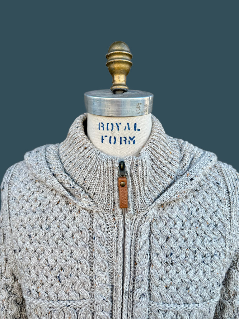 Wonderful cozy 100% wool fisherman sweater with the label, Aran Crafts. Made in Ireland. This piece is especially cool with it's front zipper closure and its ribbed mock turtle neck. Base color is grey with touches of orange and blue wool yarn. Lovely hand knit pattern and 2 pockets on the front. Nice stretch to the wool material. Such a warm winter staple.