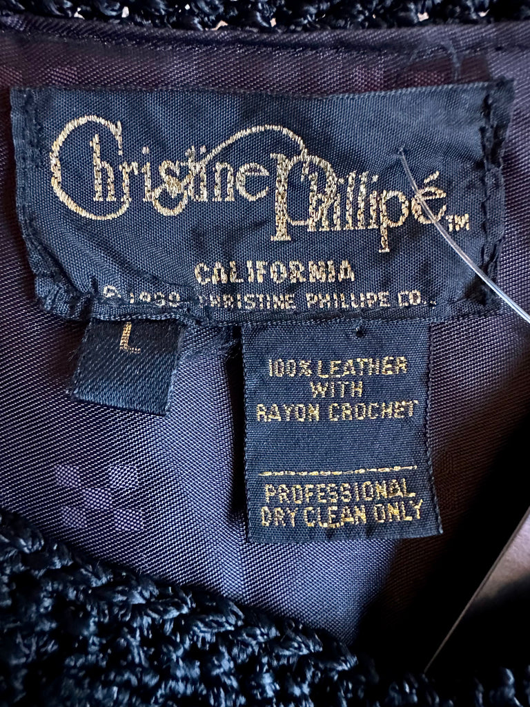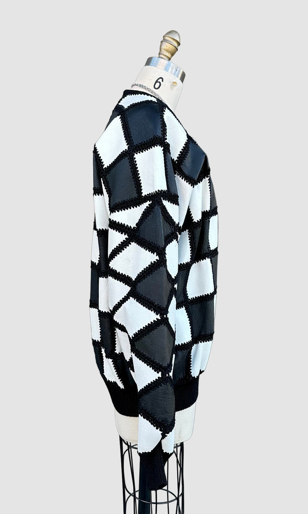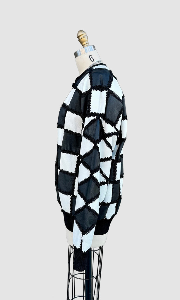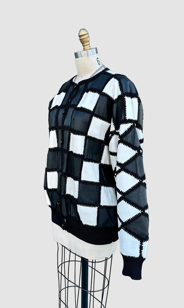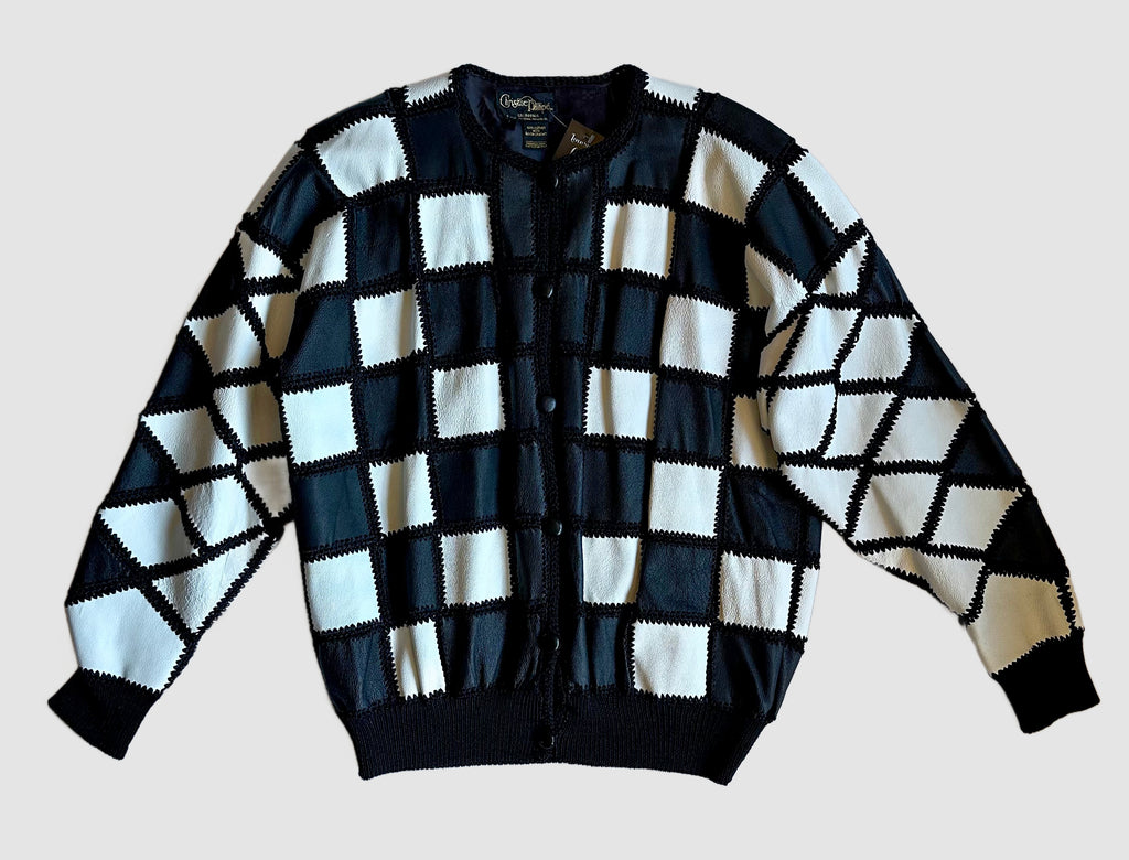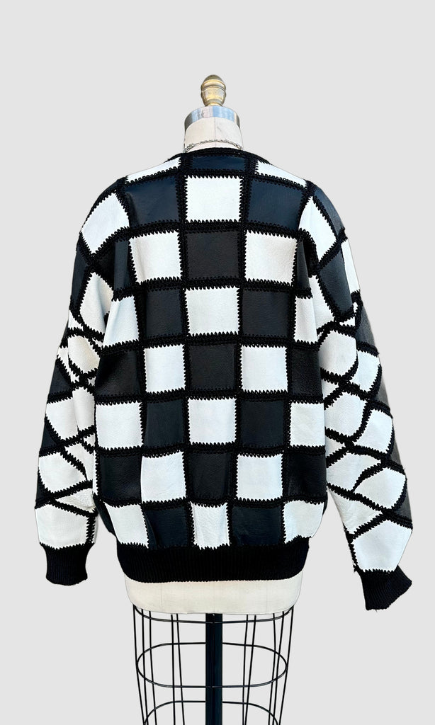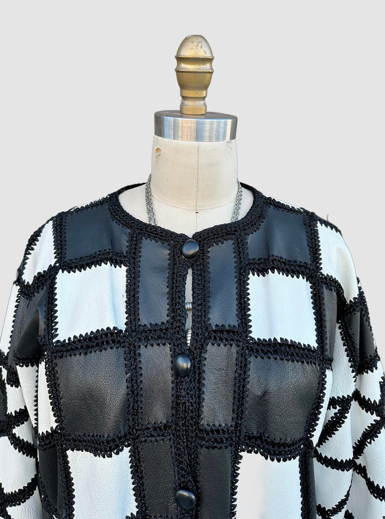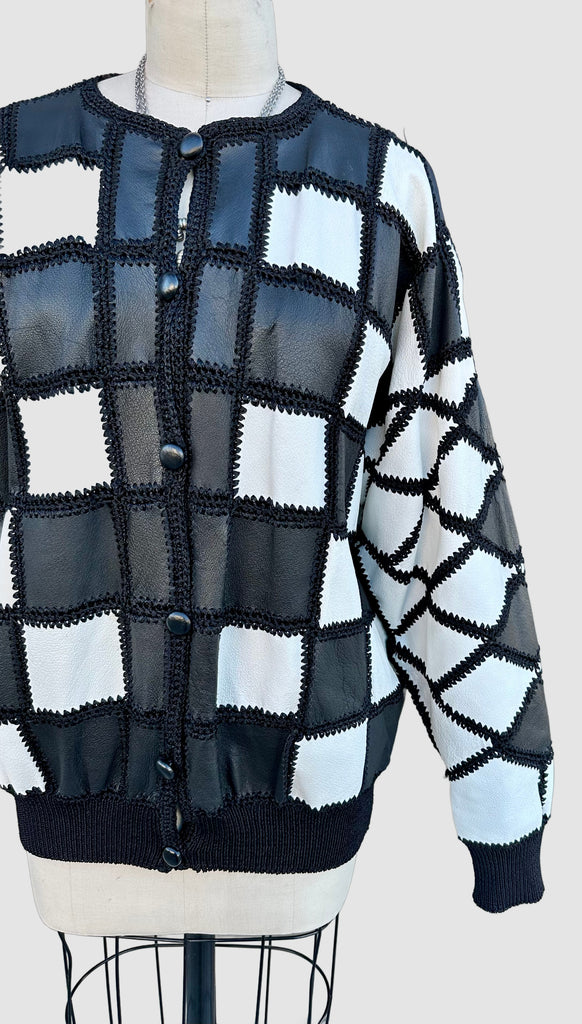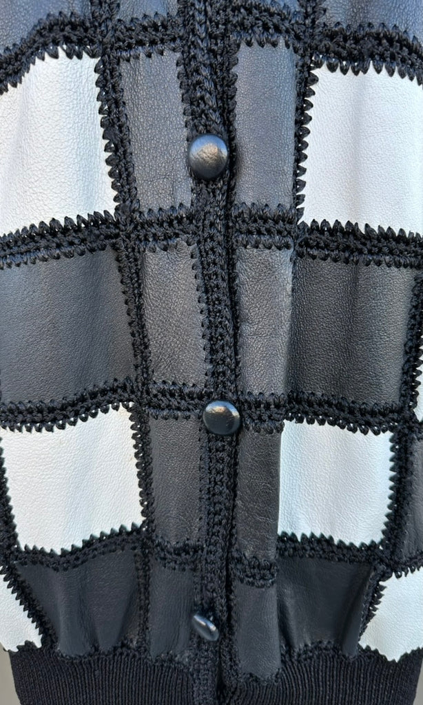 Super cool black and white leather jacket from roughly late 80's, early 90's by the brand, Christine Phillipe. Made in California. Wonderful crochet pattern that links the black and white checker squares together. Features 6 leather covered buttons for closures, ribbed cuffed sleeves and bottom hem and black satin lining.