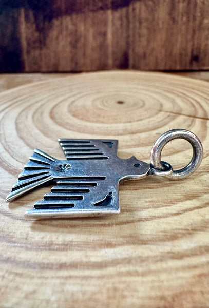 Carry this rad thunderbird charm that represents power, strength, and nobility. You can also fancy it into a necklace with the jump ring at the top. Inspired by the Fred Harvey Era style of jewelry from the 1930s-40s. This comes solely as the charm. Features a medium sized thunderbird with patina carvings. Made by Navajo artist, Dan Dodson.