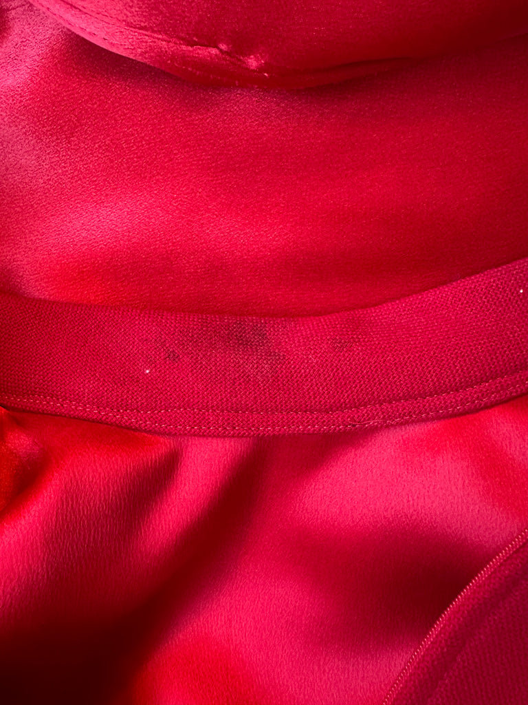 The dress has a high neck collar, darts on the bust, full silk matching lining, fur trim that wraps around the bottom hem and a long back zipper with 2 hooks for closure.