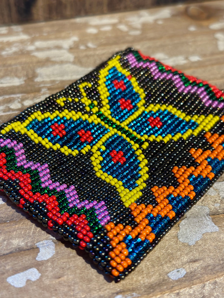 Stunning beaded coin purse, hand loomed in Guatemala with Czechoslovakian beads. The cutest butterfly beaded pattern and bright multi colors. Nice weight to the beads and perfect size for credit cards or loose change!