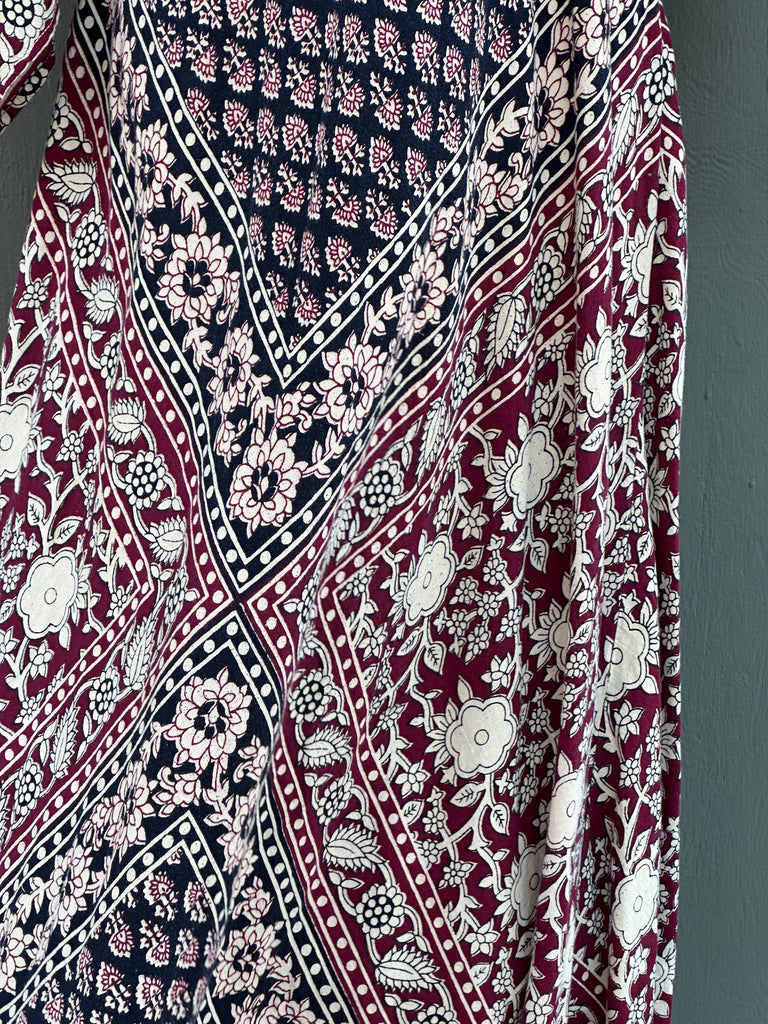 Beautiful 1970s Pakistani dress with floral block print. It's cut on the bias so it drapes effortlessly and flatters the body with every move.