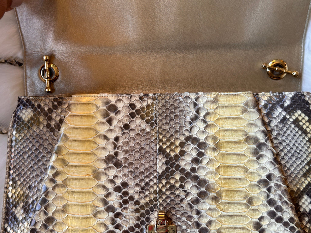 Luxurious snakeskin accordion bag with a structured front flap. A peek beneath the snakeskin strap reveals gold-tone metal, creating a beautiful effect as subtle flashes of gold shimmer through the skin overlay. The interior is roomy and features a single wall pocket. Finished with gold-tone hardware and a jeweled clasp for an extra touch of glamour.
