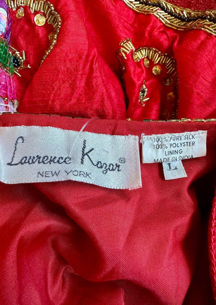 90's disco glam cardigan by, Laurenee Kazar of New York. This jacket features intricate bead work and details, made in India. The base material is 100% silk in a rich red color with the rest of the sequin and bead work is in a range of purple, pink, greens and gold colors. Fun abstract shapes and patterns run horizontally across the vest. Shoulder pads. 6 silver hook and eye closures that run down the front for closure. Red rayon lining. Such a gorgeous piece!