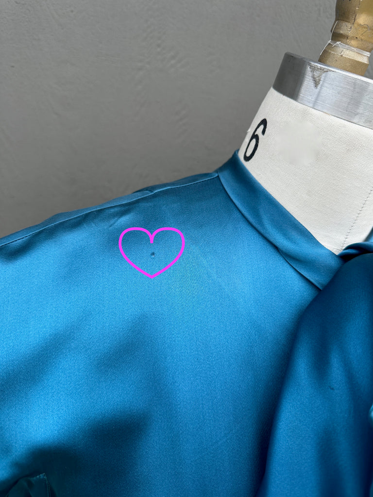 One tiny hole near the shoulder (hidden beneath the bow and barely noticeable). One faint, small discoloration near the waist that is only visible in certain lighting. These minor flaws do not detract from the overall beauty. Cleaned and ready to wear.
