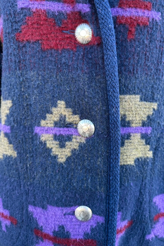 The coziest 90's outdoor wool button up coat by the brand, Woolrich. Features a fun geometric winter pattern with red, beige and purple colors and navy blue base. There are 3 silver metal buttons that run down the front of the sweater for closure and a nice large collar to keep warm. 2 side pockets on the front. Such a cozy winter staple.