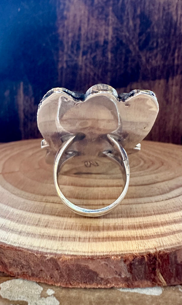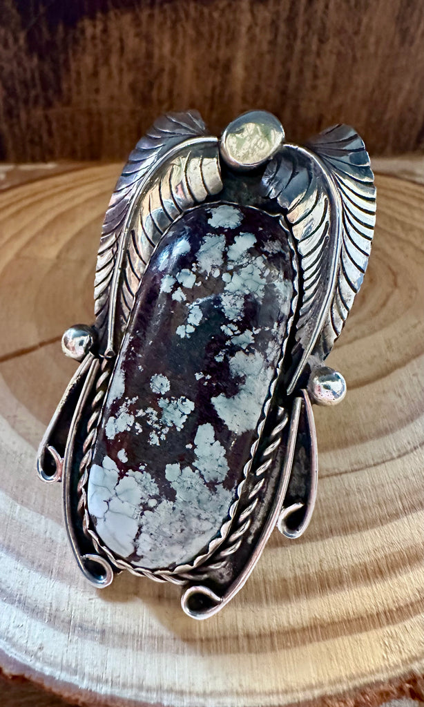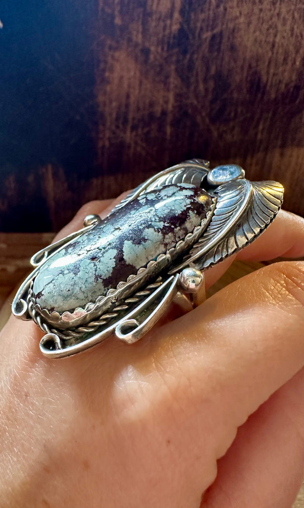 Gorgeous icey blue turquoise and sterling silver ring. This piece is made by Navajo artist, two feathers and is hallmarked on the inside of the ring. Beautiful rich brown matrix within the ice blue, almost white color turquoise cabochon. Detailed silver scroll and leaf applique all around the sawtooth bezel and braided silver frame. Nice and thick double split single band. Truly a show stopping statement piece!